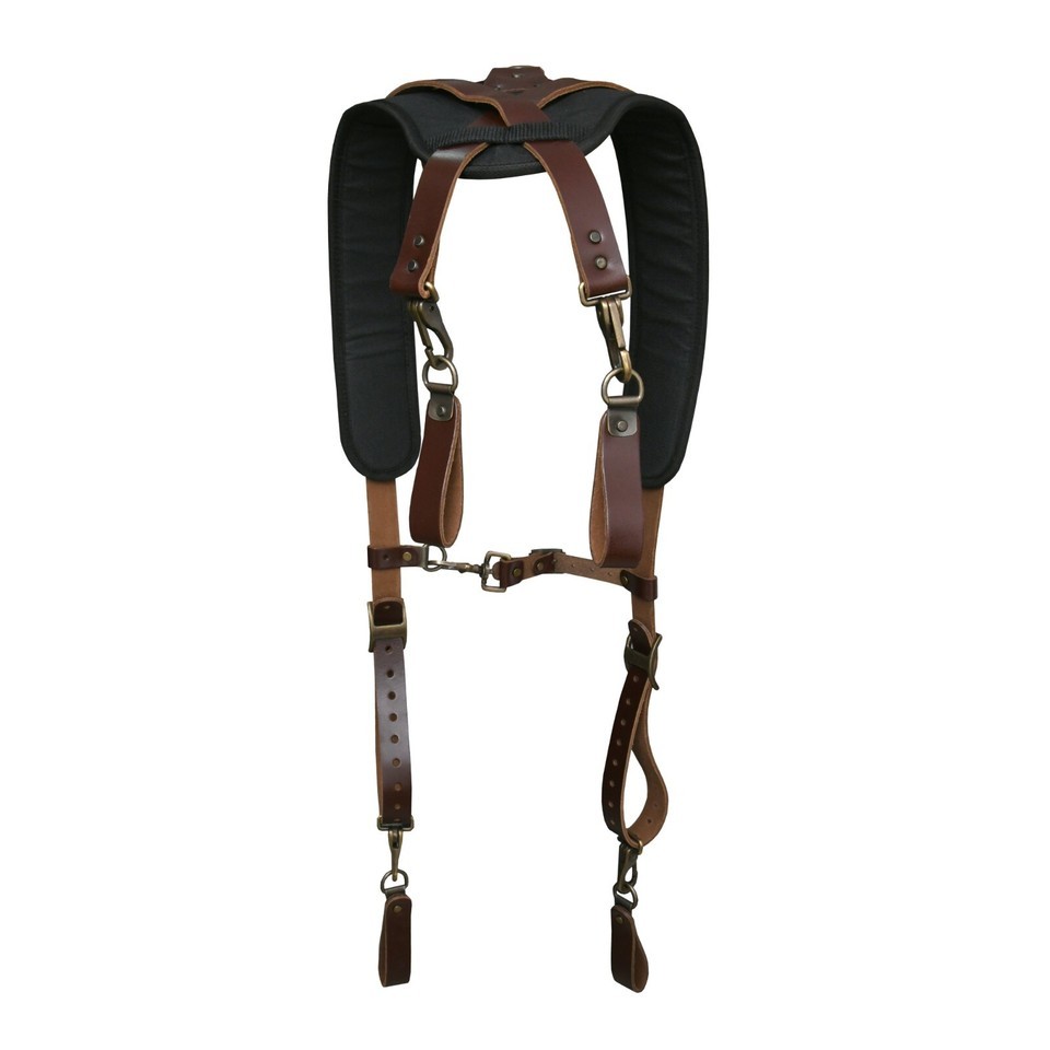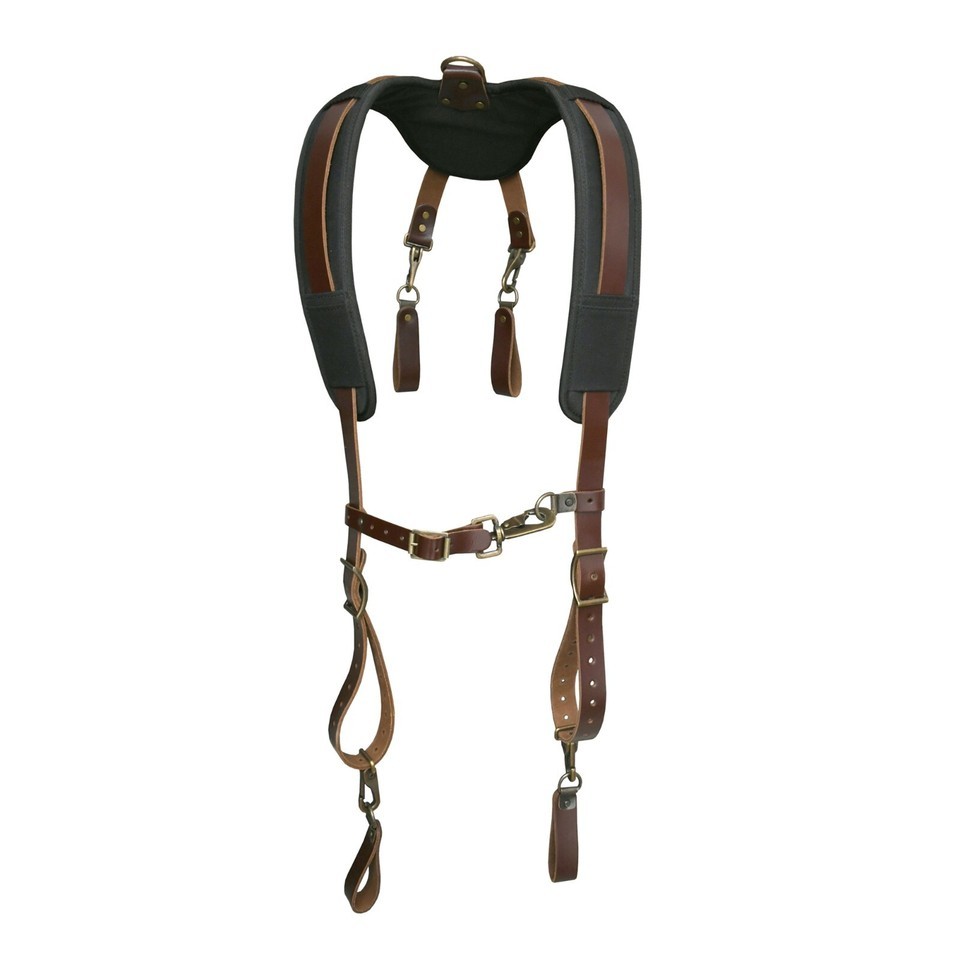 A 3/4" wide horizontal leather strap on the front joins the 2 vertical suspender straps to keep them in place