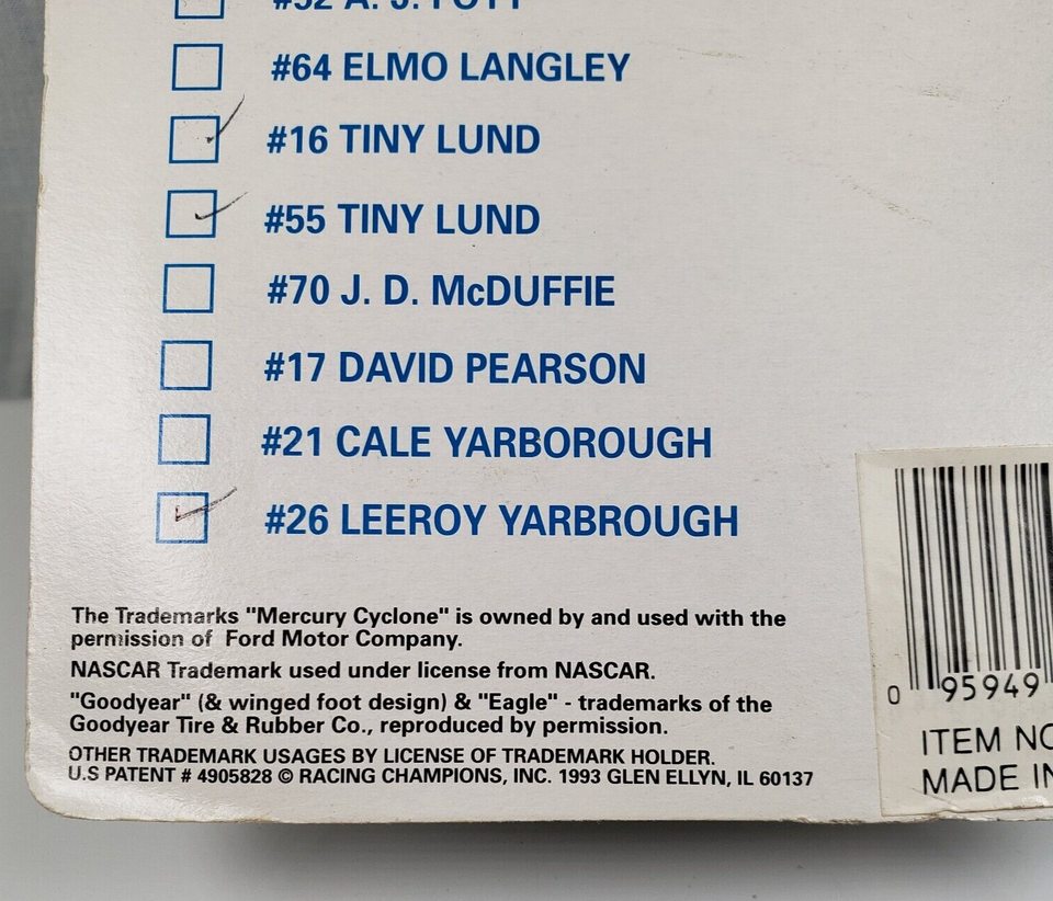 Racing Champions Nascar Mercury Cyclone Collector's #26 Leeroy Yarbrough Diecast