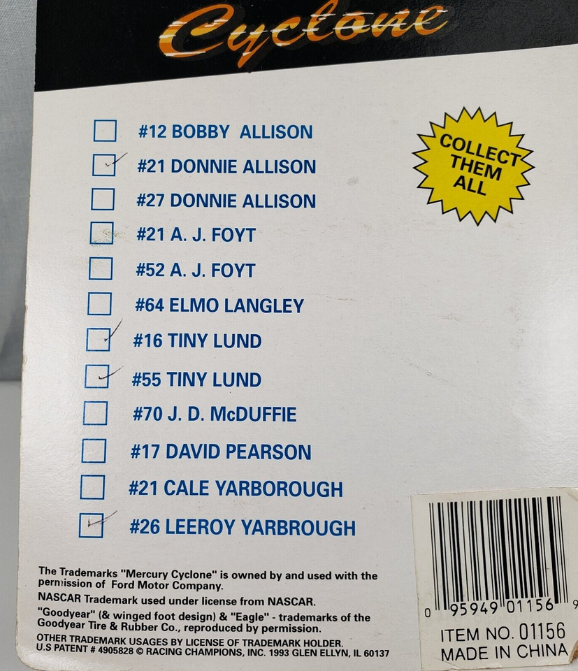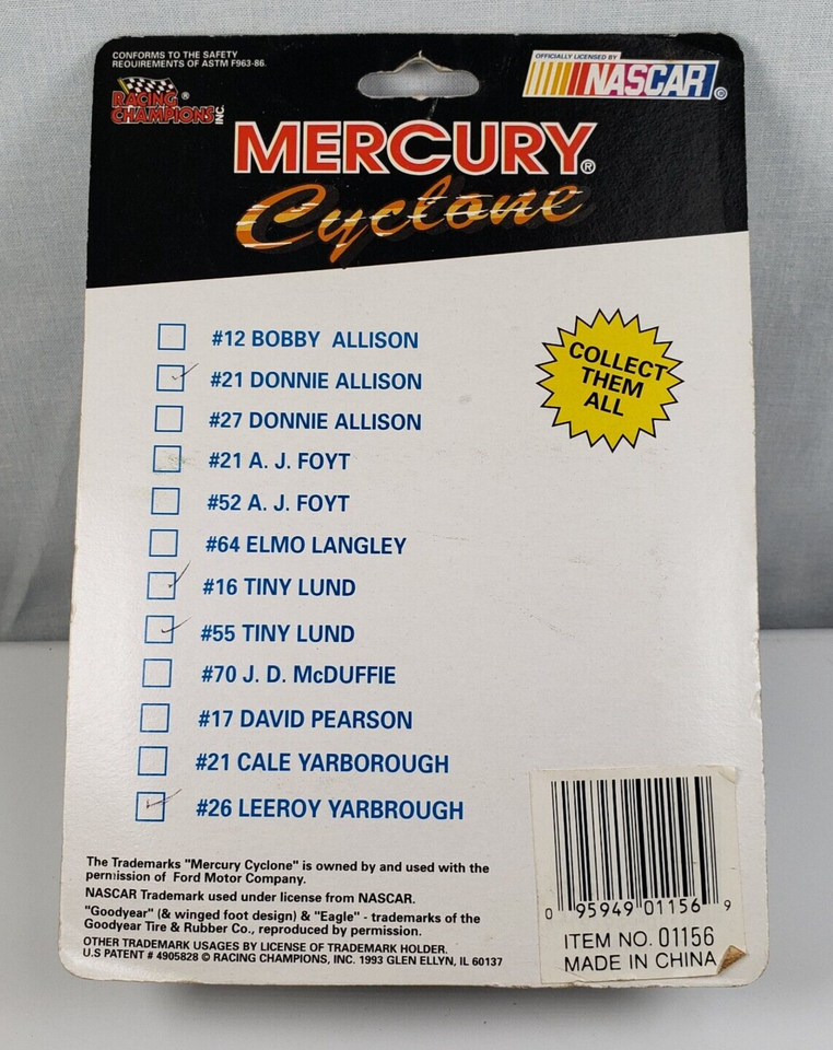 Racing Champions Nascar Mercury Cyclone Collector's #26 Leeroy Yarbrough Diecast New On Card