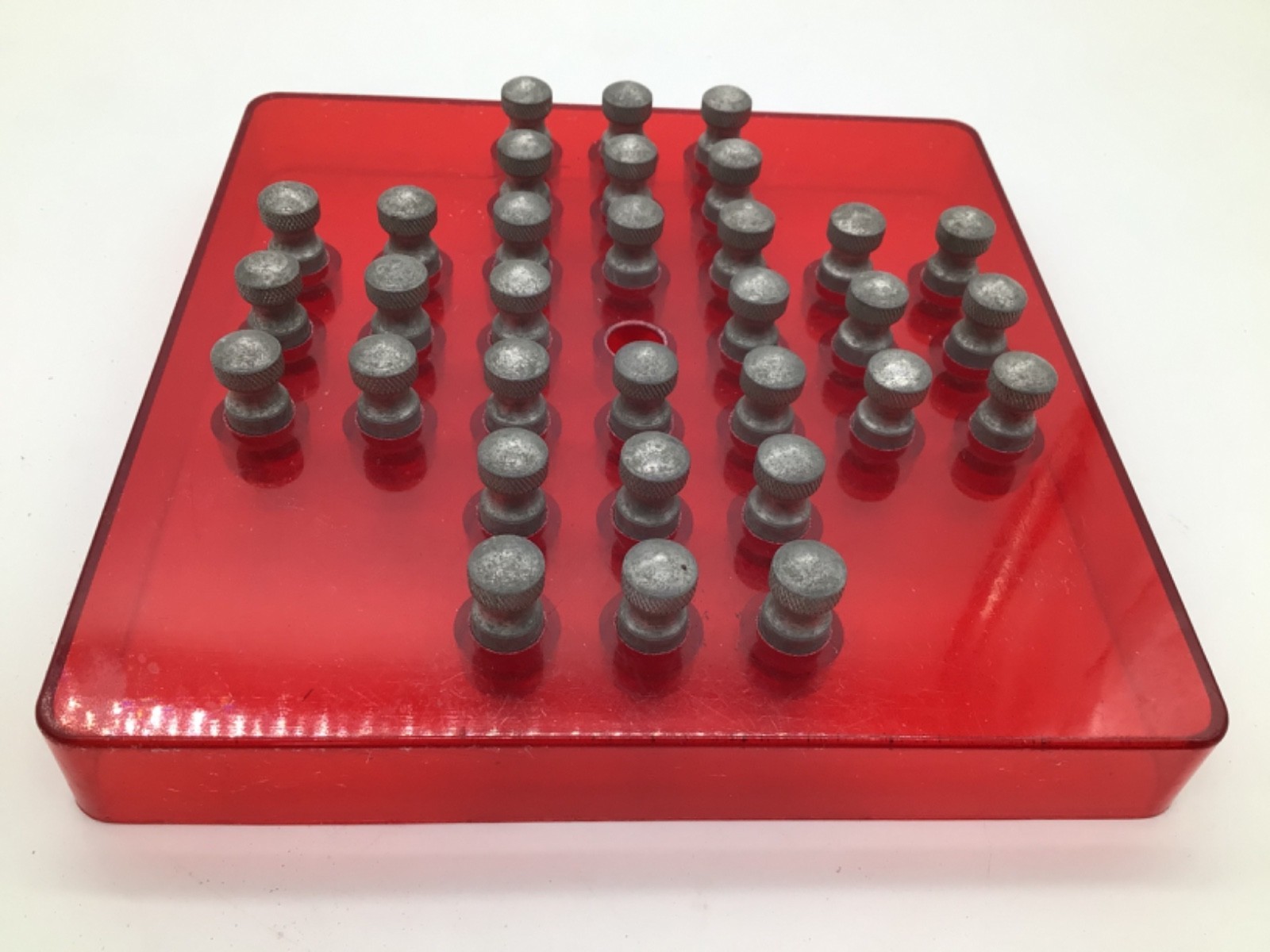 This vintage Lucite solitaire peg game combines retro style with classic brain-teasing fun. The bold red base and heavy metal pegs make it a standout display piece and a challenging game in one.
