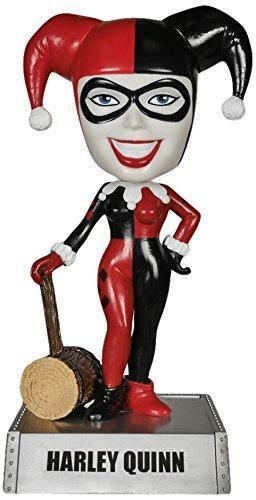 The Joker's right hand woman Harley Quinn gets the bobble head treatment! This Batman Harley Quinn Bobble Head stands about 6-inches tall atop her name display base and is flashing a large smile and has her trusty wooden mallet by her side. Harley Quinn Bobble Head features her in her red and black outfit and comes in a colorful window box packaging.