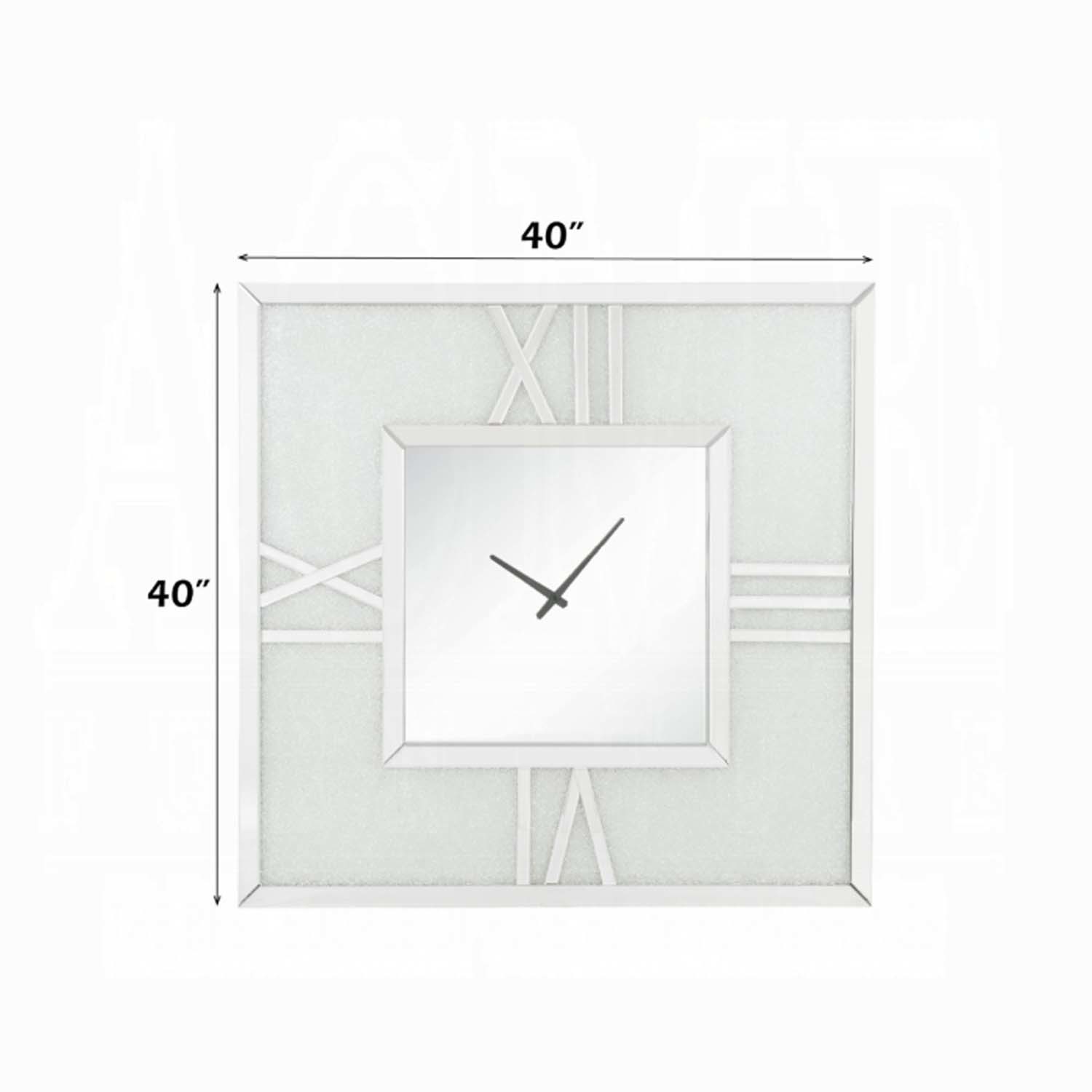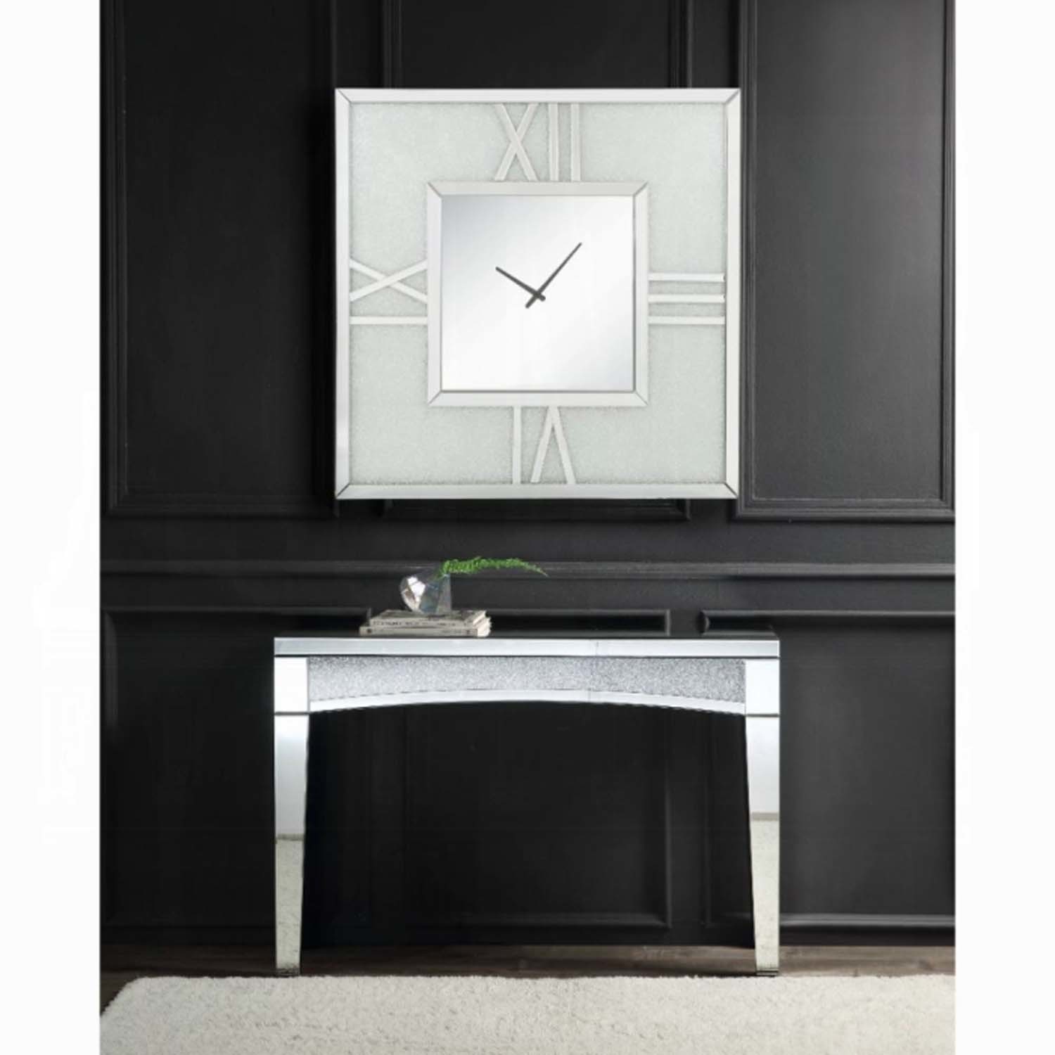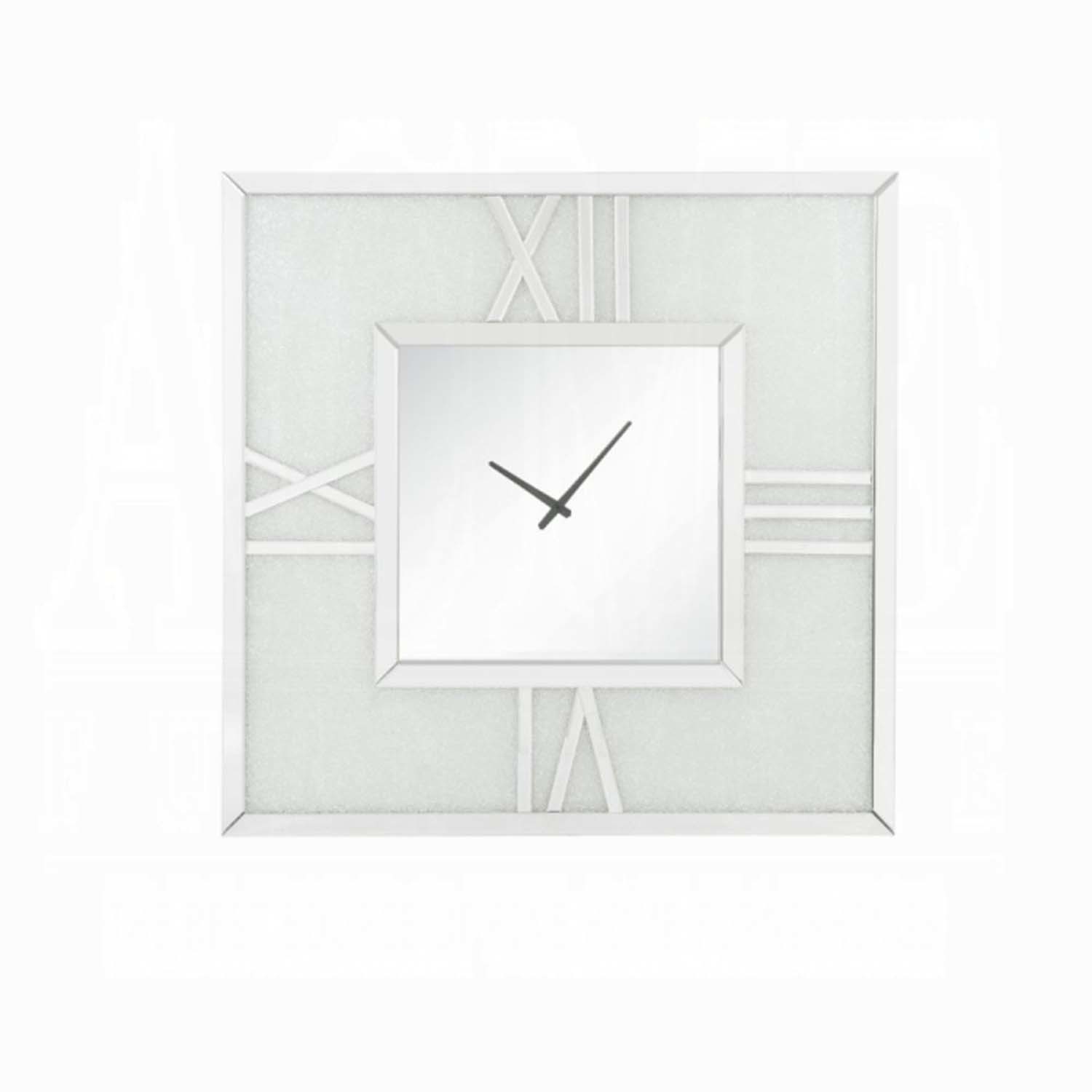 This Noralie square wall clock is covered in beveled mirrored panels that highlight its glamorous style. Featuring crushed acrylic faux diamonds that will naturally attract the eye. Durable engineered wood supports the frame. The clock face comes with a timeless roman numeral design.
