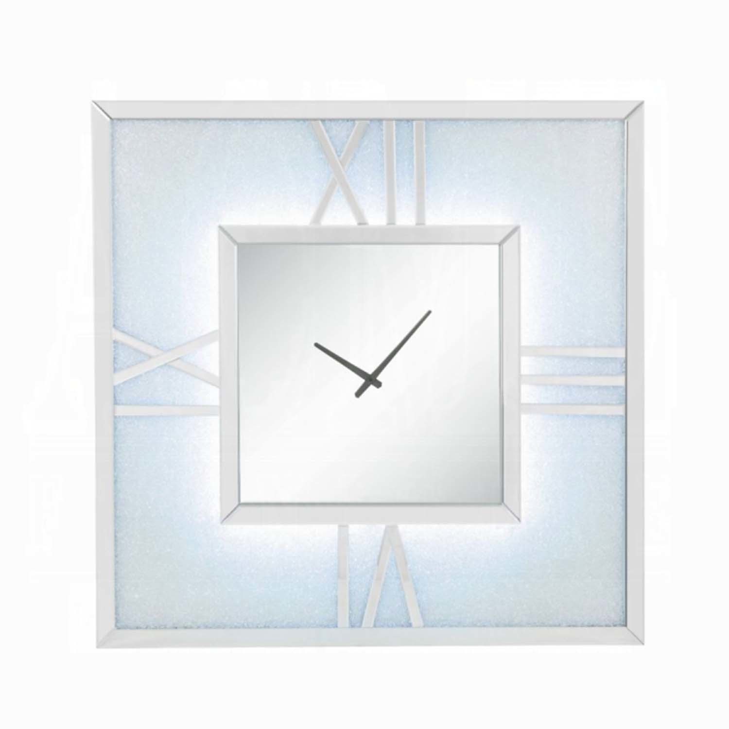 Features: Square Wall Clock LED Touch Light Included Mirror Trim, Beveled Edge, Clear Glass Faux Diamond Inlay Dial Numeral Type: Mirrored Roman Numerals Quartz Mechanism Set Includes: One (1) Wall Clock