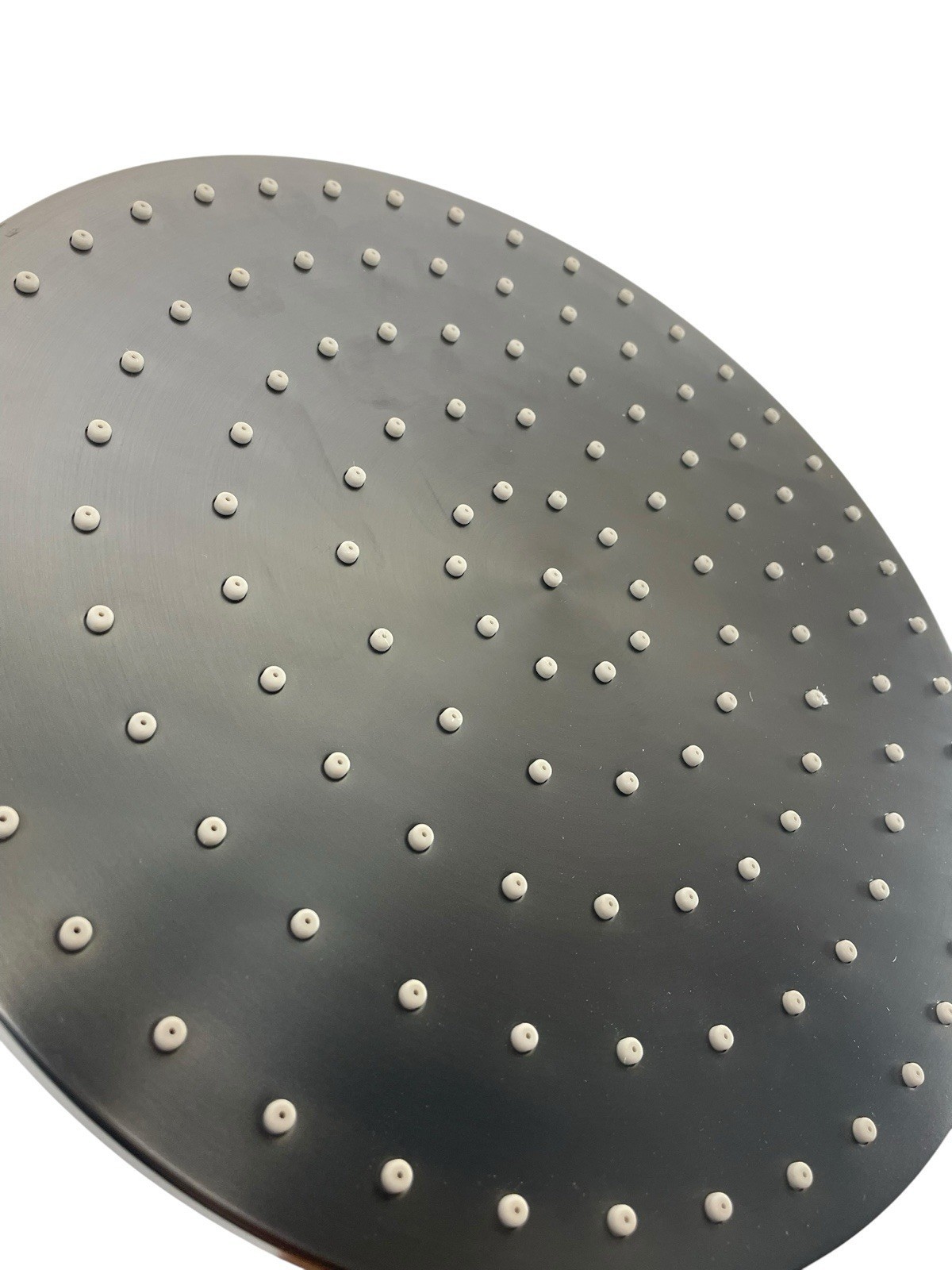 Round design uses a round showerhead to reduce visual footprint while maximizing shower spray surface area