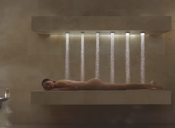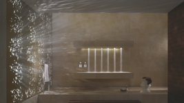 The Horizontal ShowerATTprovides, for the first time, a reclining shower experience. The application includes six WaterBars that are recessed in a wide-area shower field located above a reclining space. The shower uses a central eTool control, built into the head area of the recliner, to act as a main control element; making it convenient to operate while lying down. Three pre-programmed choreographies offer Balancing, Energizing or De-Stressing effects by controlling the water?s temperature, intensity and quantity. Occupants can recline on their back, side or front to enjoy the flows.