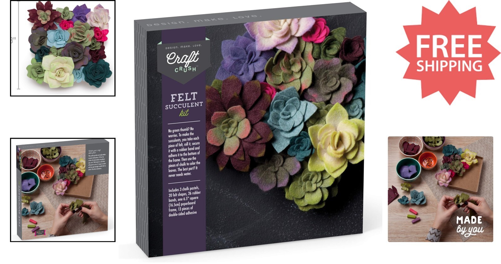 Transform your space with the Craft Crush Felt Succulents DIY Kit. This complete set includes everything you need to craft 18 stunning felt succulents, perfect for brightening up any sunroom, living room, or kitchen. With easy-to-follow instructions, no prior crafting experience is necessary?just your creativity! Showcase your handcrafted succulents in a stylish frame or individual pots to create a modern, maintenance-free garden aesthetic. Ideal as a unique gift or a personal home decor project, this kit is designed for ages 13 and up to enjoy a fun, engaging experience. Elevate your interior design with these trendy, never-watering plants?an instant conversation piece and a beautiful artful touch.