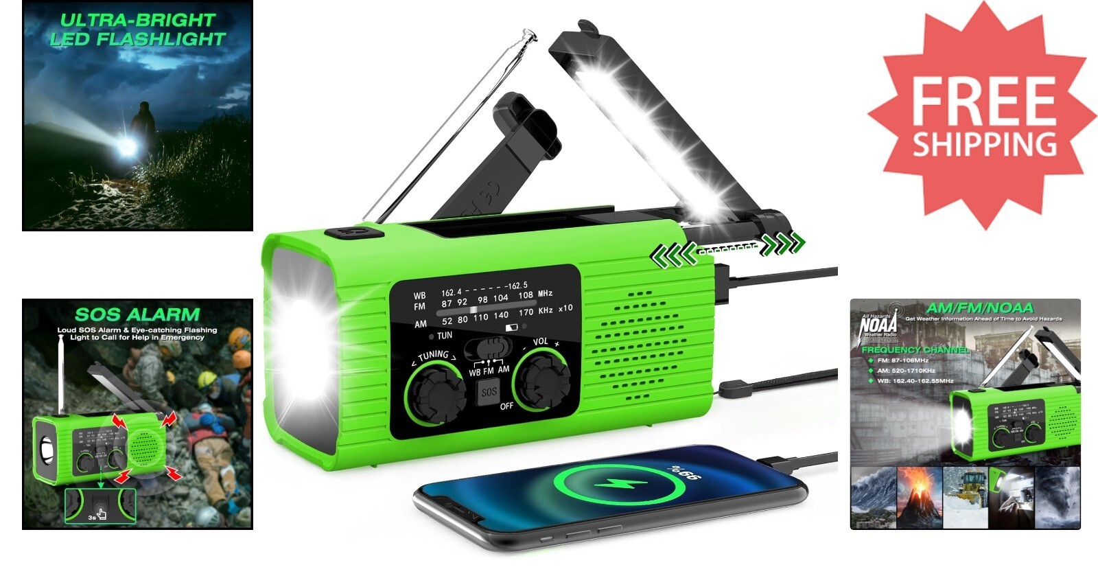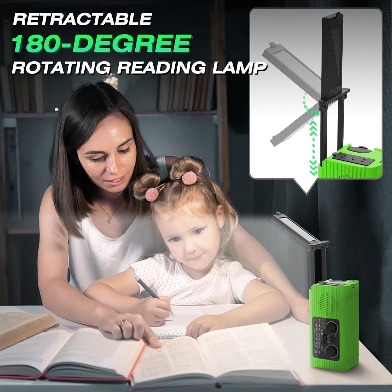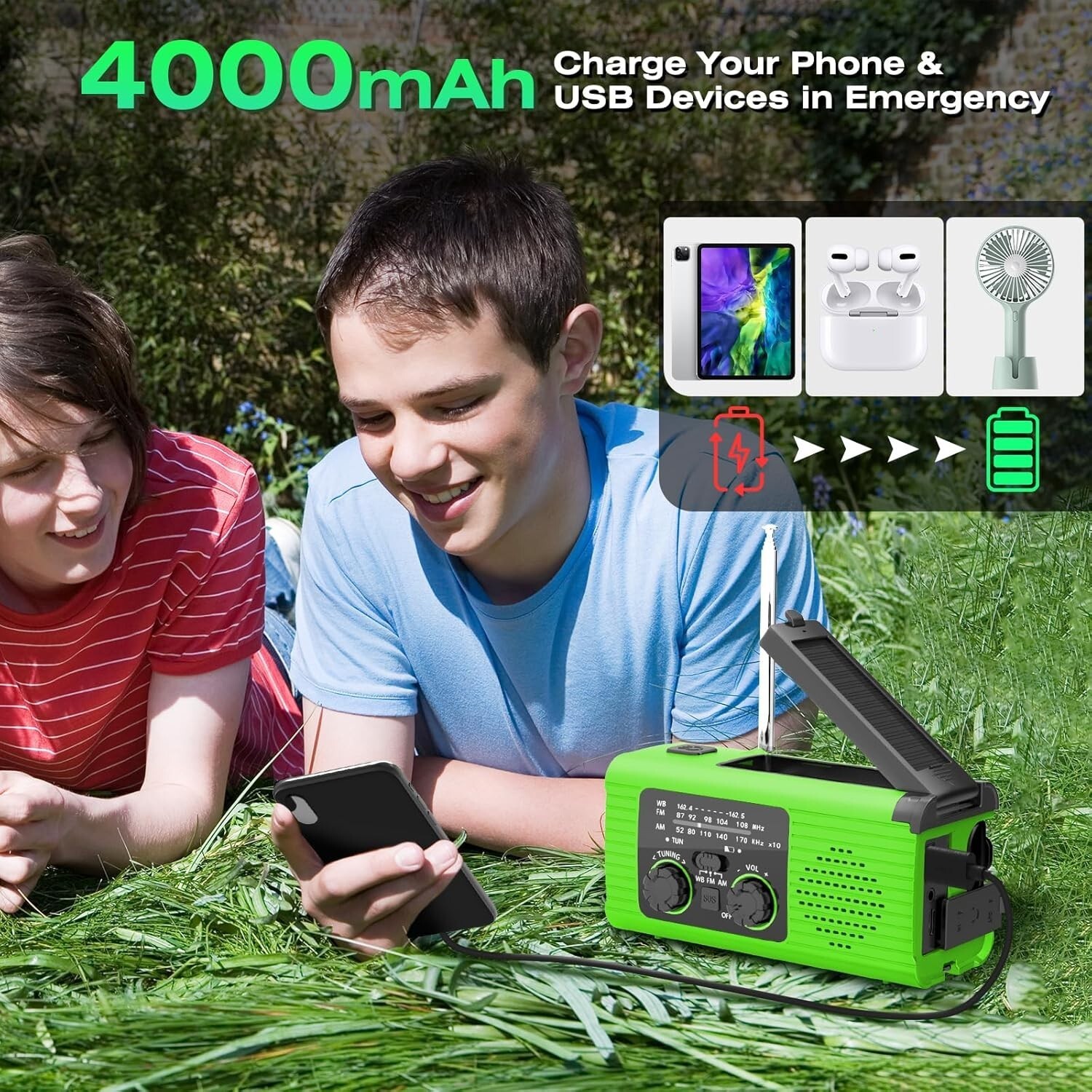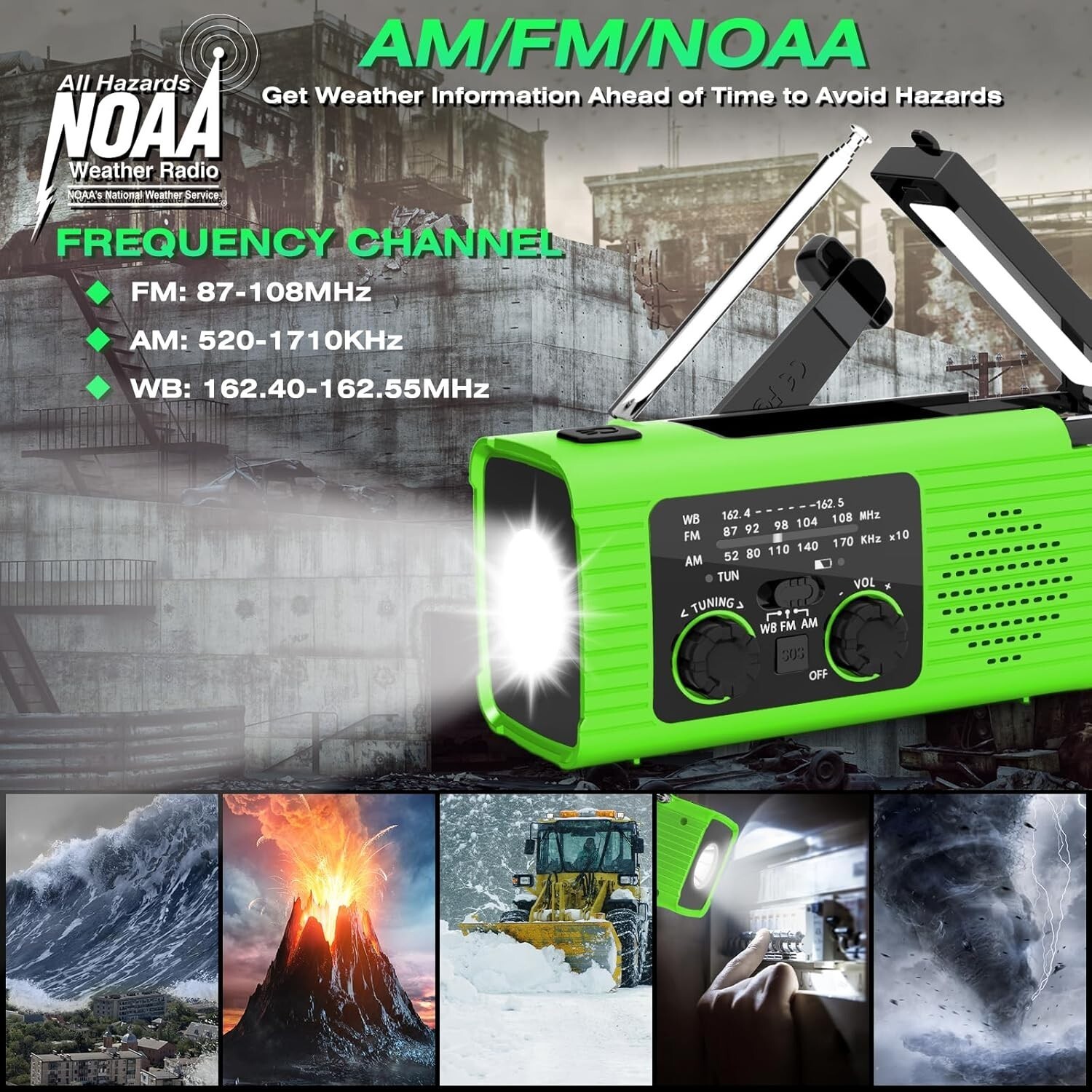 Stay prepared with the NITIGO Emergency Weather Radio, a reliable device equipped with a 4000mAh rechargeable battery capable of charging via USB, solar panel, or hand crank?ensuring continuous operation during power outages. Featuring multi-functional tools including a bright LED flashlight, adjustable reading lamp, loud SOS alarm, and a USB charging port for your devices, it?s perfect for emergencies. The compact design offers AM/FM/WB tuning on 7 NOAA weather channels with excellent reception, making it ideal for staying informed in any situation. Its durable, waterproof, and drop-proof construction ensures longevity in harsh environments. Whether for disaster preparedness or as a thoughtful gift, this versatile radio is your essential emergency companion.