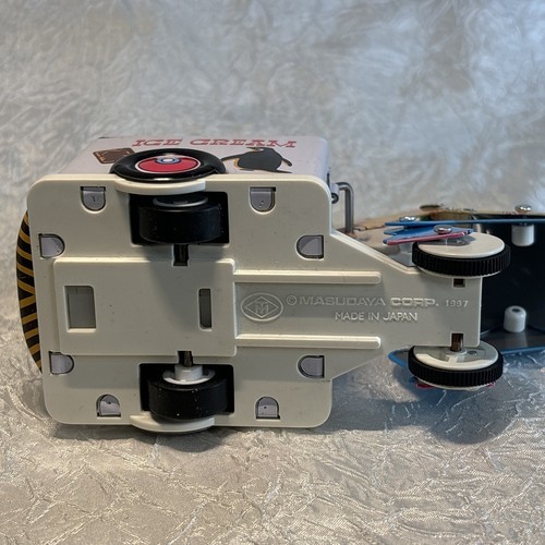 This vintage Masudaya toy from Japan is a must-have for collectors. With its classic 1950s style and pull-back motor, it's sure to bring hours of enjoyment. The toy features an ice cream vendor design and comes with pictures to add to its charm.