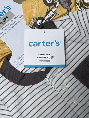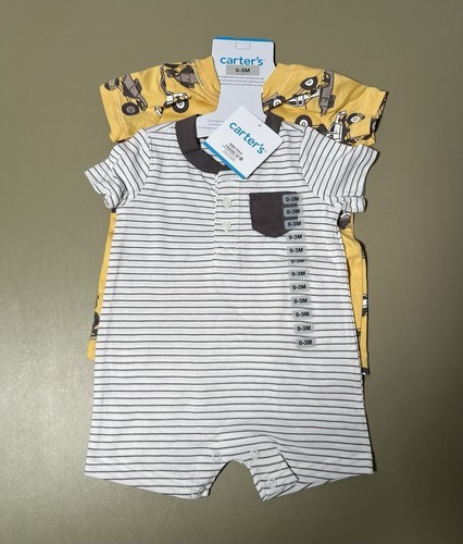 This set of two Carter's one-piece outfits is perfect for your little one, featuring a white and gray striped design and a yellow outfit with trucks. Both pieces are made for babies and toddlers ranging in size from 0-3 months, and are sure to keep them comfortable and stylish.