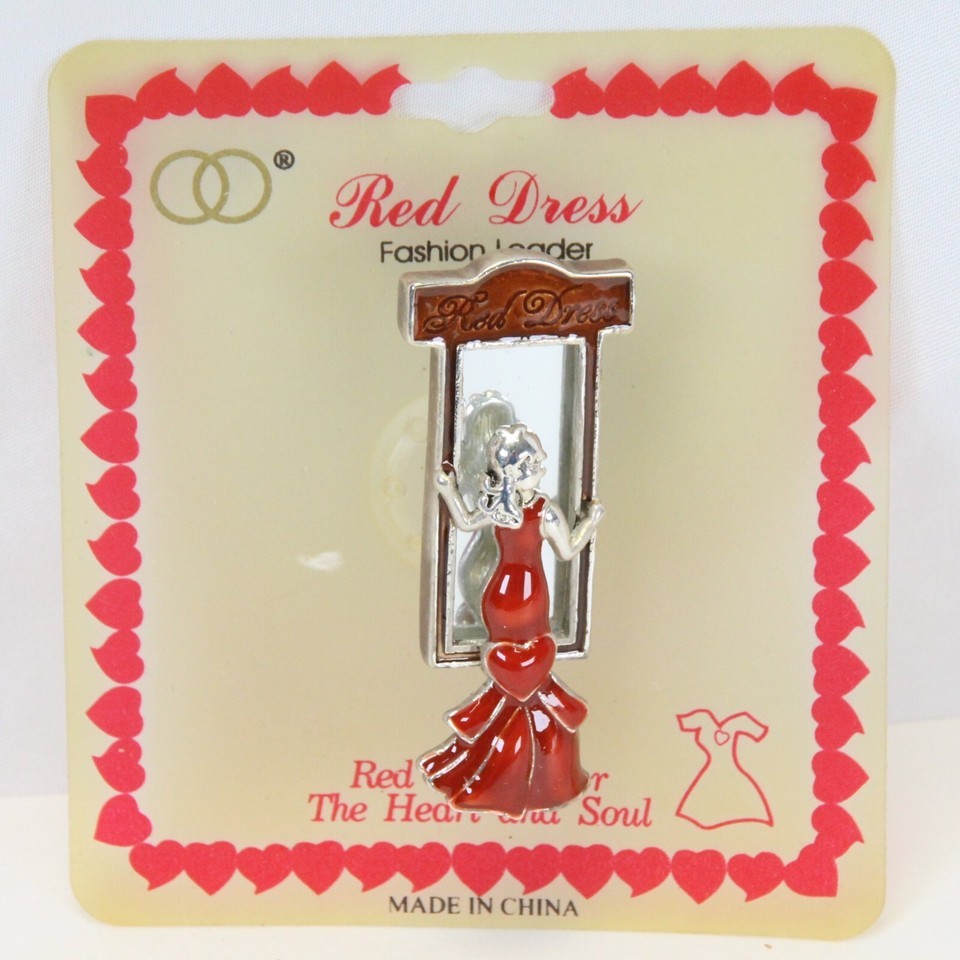 Red Dress Woman Looking in Mirror Enamel Pin Brooch Vanity Jewelry NEW