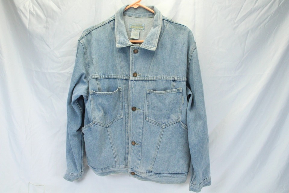 Denim Trucker Jacket USA Flag Patch Women Size M 17 Pins USA Flags Ocean Denim