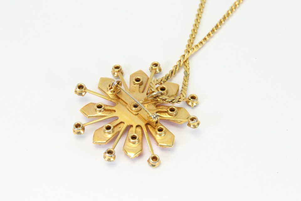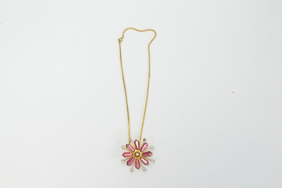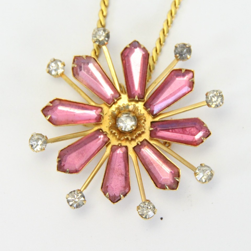 Rhinestone Pink Brooch Necklace with Faux Diamonds 1-3/4" Dia Gold Tone