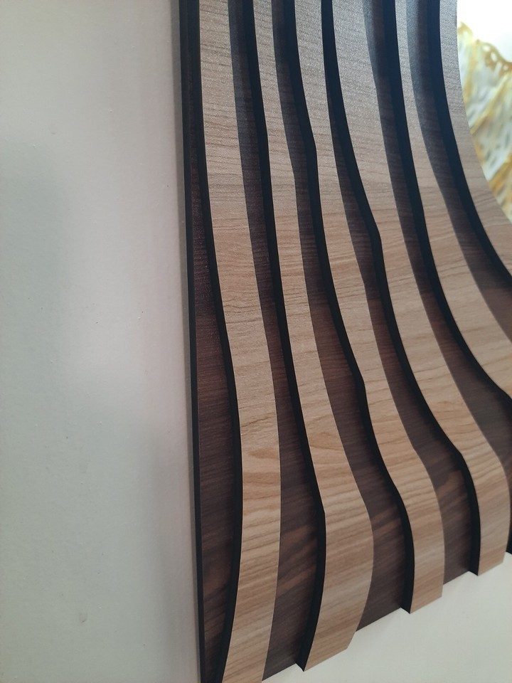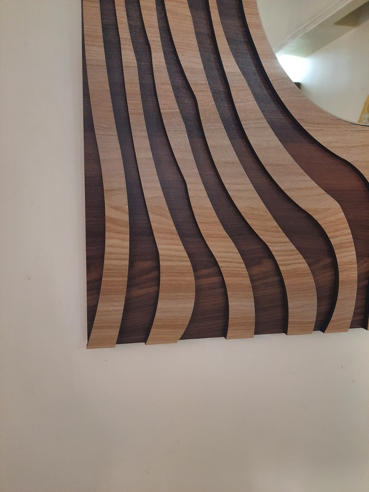 Due strati di legno da 3 mm incollati insieme con gli specchi in mezzo, un design molto moderno e contemporaneo che e anche molto robusto e resistente. Ha 2 ganci metallici sul retro per appenderlo.