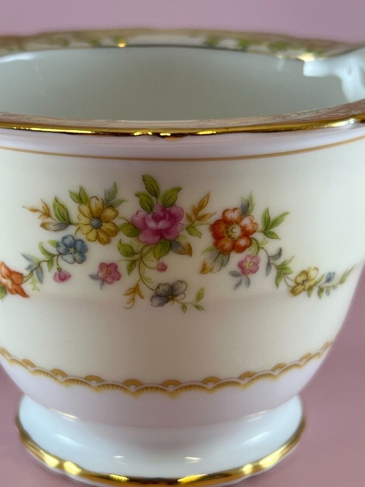 and blue flowers on it. It is trimmed in gold. The rim of the creamer has a