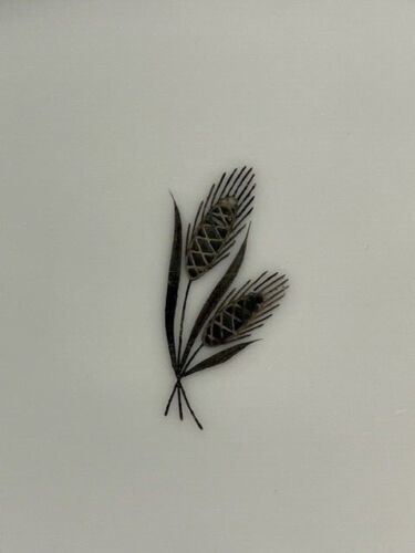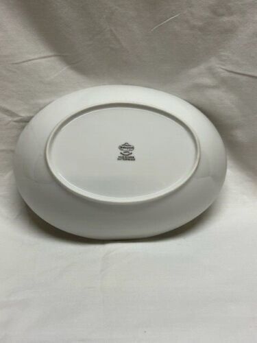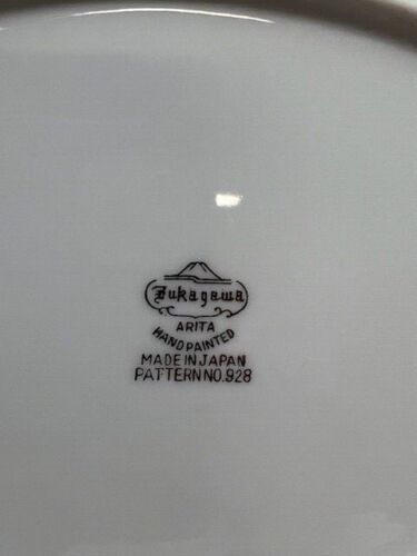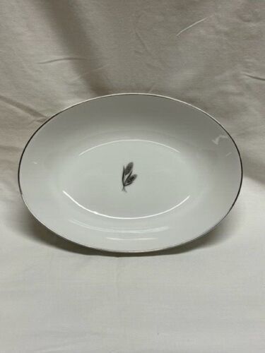 This is a Fukagawa Arita hand painted Silver Wheat oval serving bowl made in Japan. The pattern number is 928. The bowl is white with silver around the rim. The silver around the rim shows minimal wear. The wheat in the center of the bowl is painted silver and brown. The bowl measures 10.25 inches by 7.5 inches.