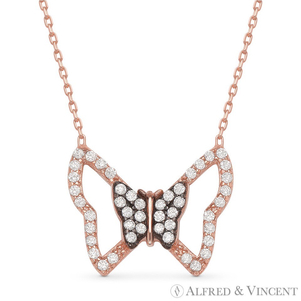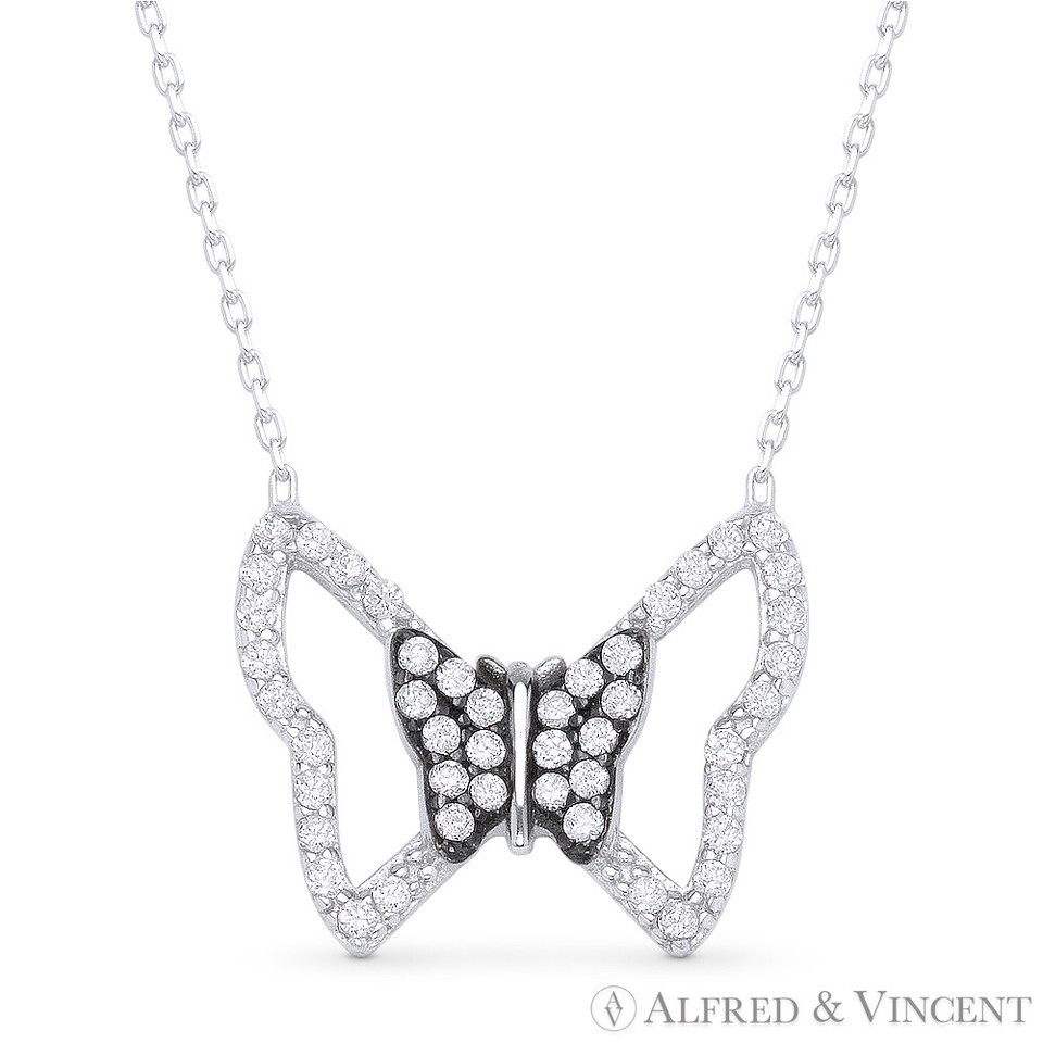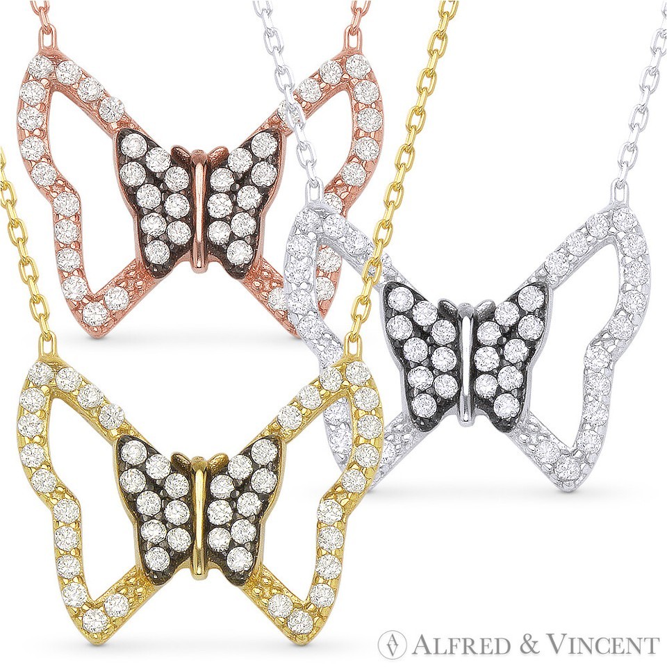 The featured necklaces are cast in .925 sterling silver and showcase butterfly charms adorned with cubic zirconia crystals. The pendants are then attached to cable-link chains finished with spring-ring clasps and 2-inch extender links for secure wear.