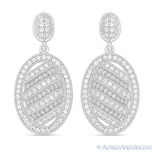 Oval Micro-Pave Cubic Zirconia CZ Crystal 925 Sterling Silver Dangle Earrings