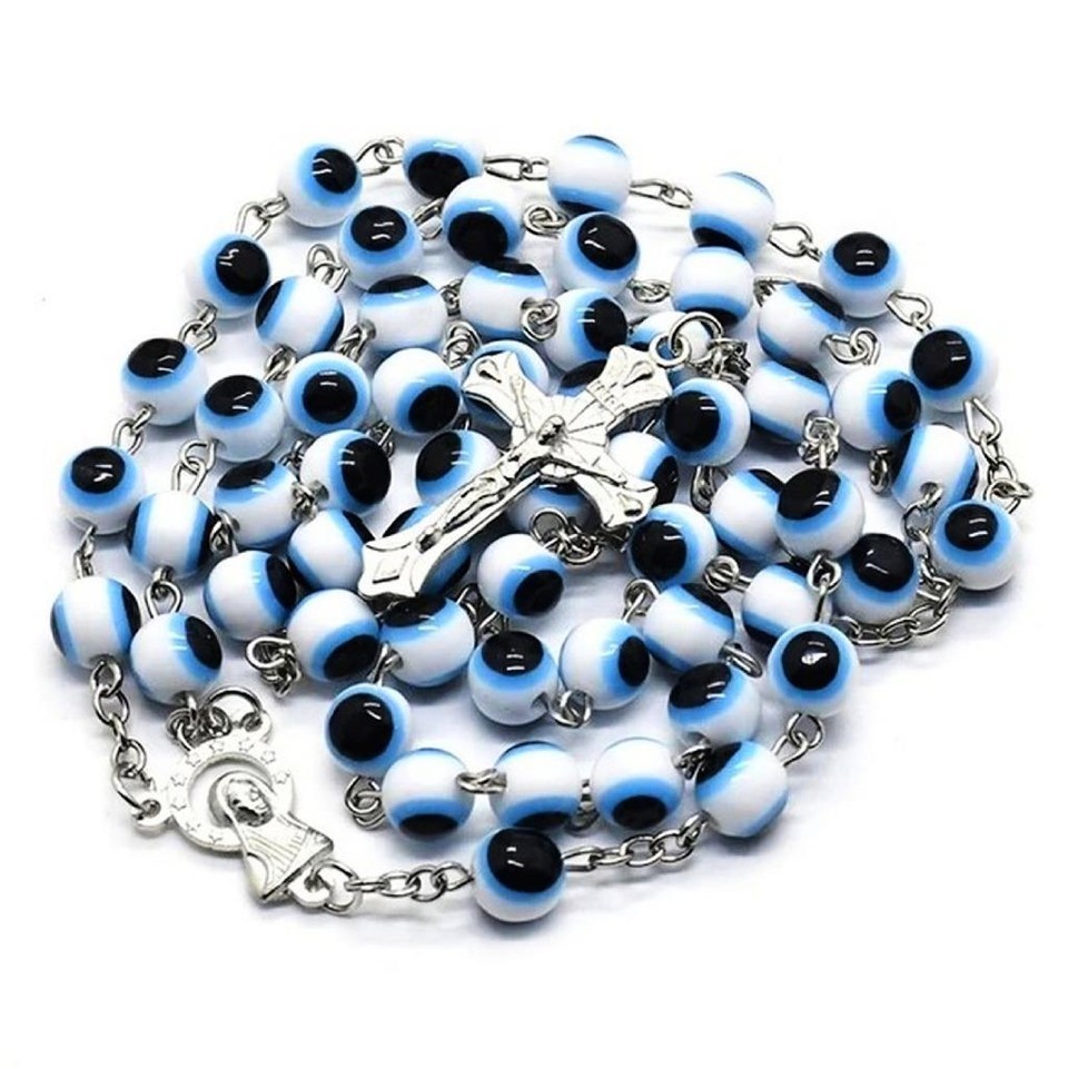 EVIL EYE ROSARY 30" Necklace 6" Drop 8mm Blue White Prayer Beads Cross Crucifix