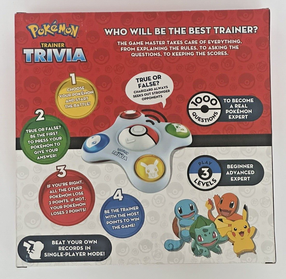 Who will be the best Pokemon Trainer? Pokemon Trainer Trivia has 1,000 questions to turn you and your friends into real Pokemon experts! Choose your Pokemon and start to battle! True or false? Be the first to press your Pokemon to give your answer! If you're right, all the other Pokemon lose 2 points. If not, your Pokemon loses 2 points! Be the trainer with the most points to win the game!
