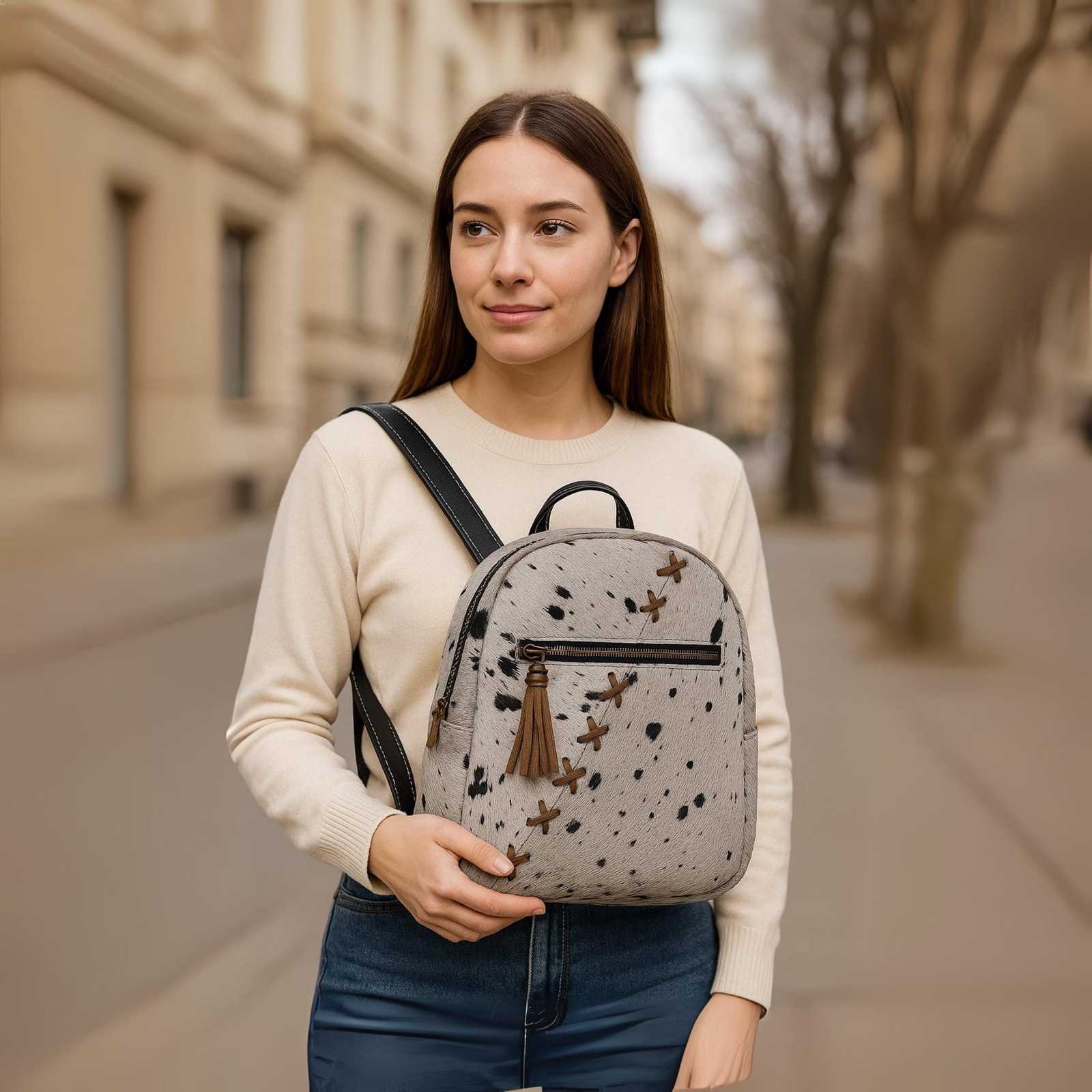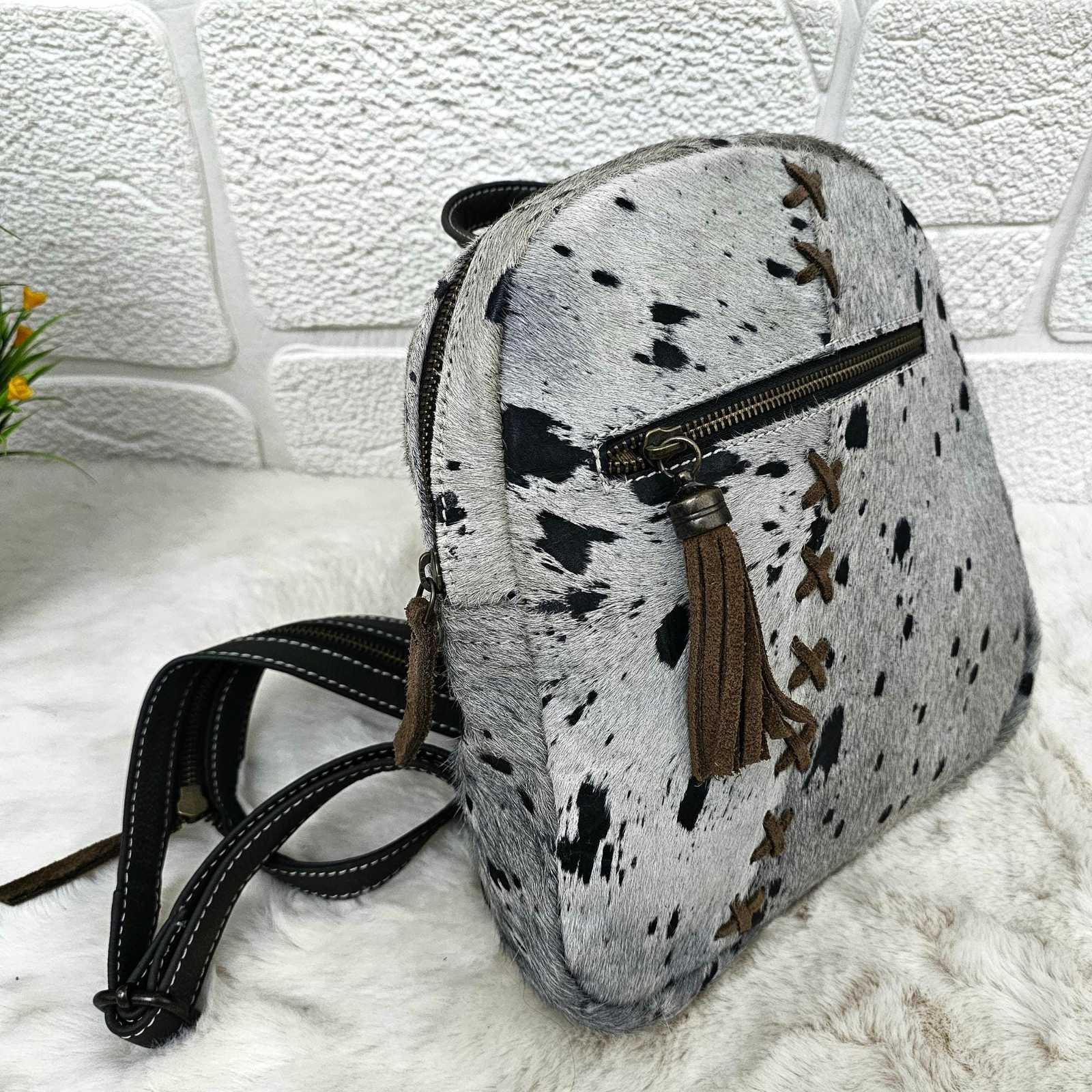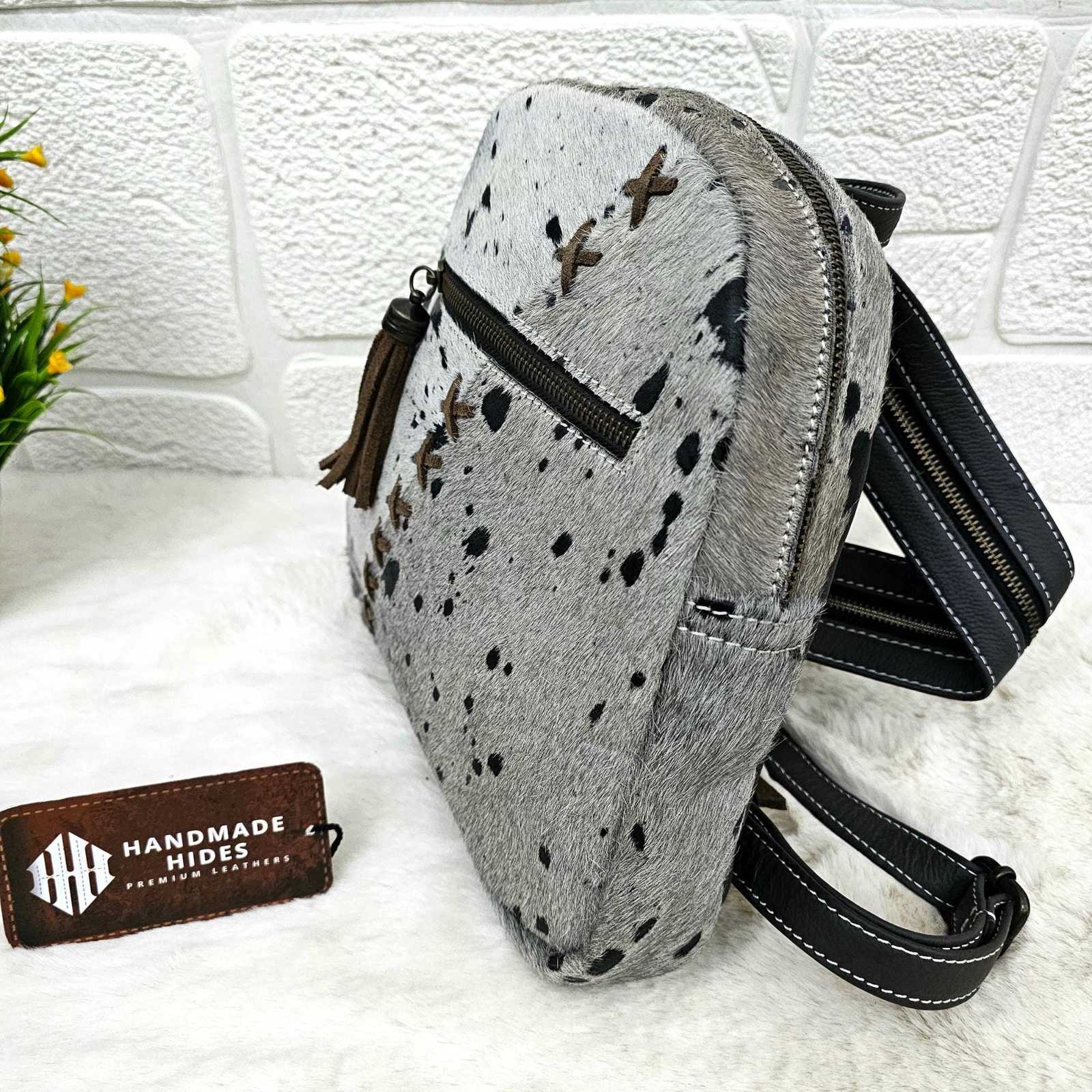 Handmade Gray Hair-On Goat Leather Mini Backpack | Tassel Zip Travel Bag, Stylis