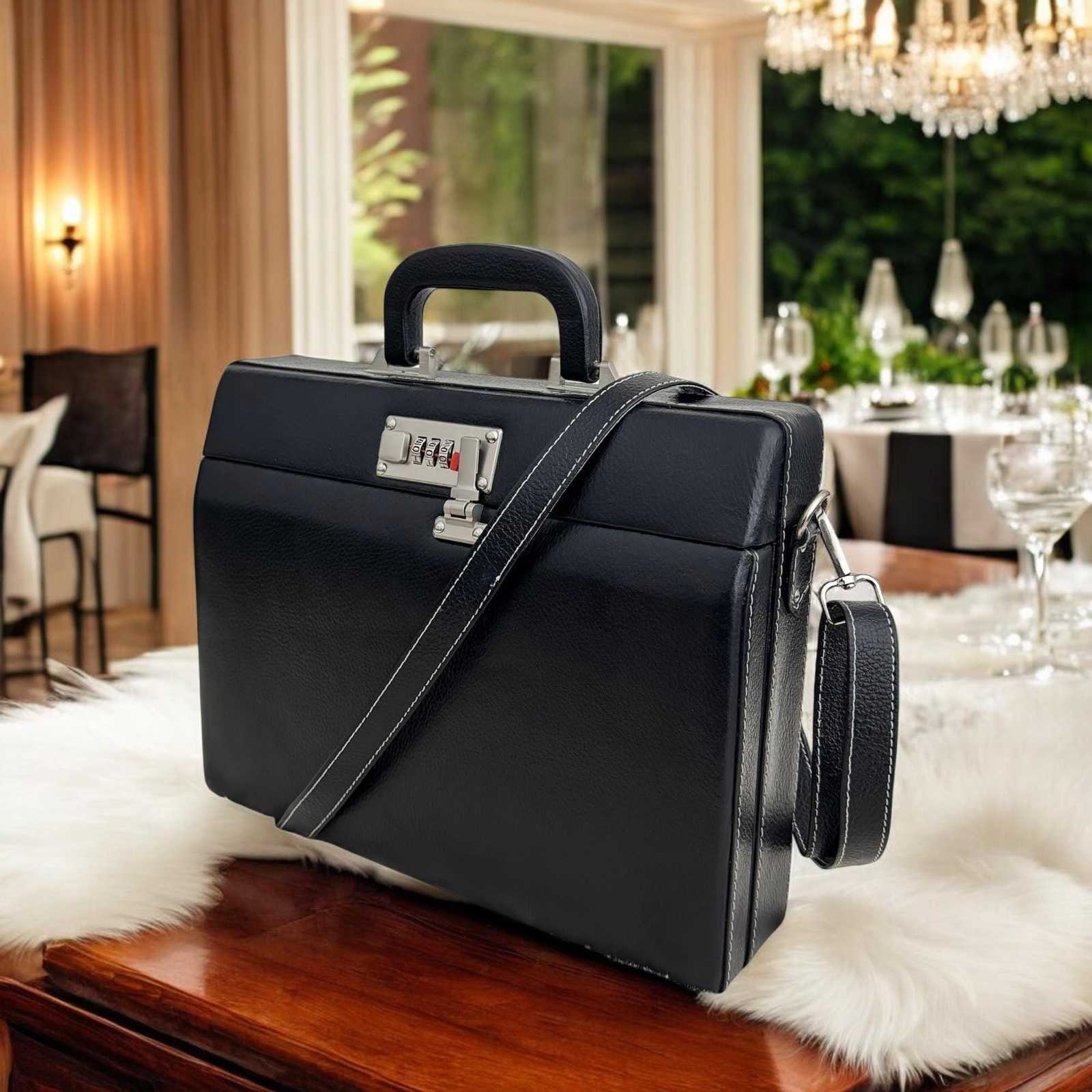 Full Grain Leather Briefcase: Black Laptop Bag with Lock & Adjustable Strap