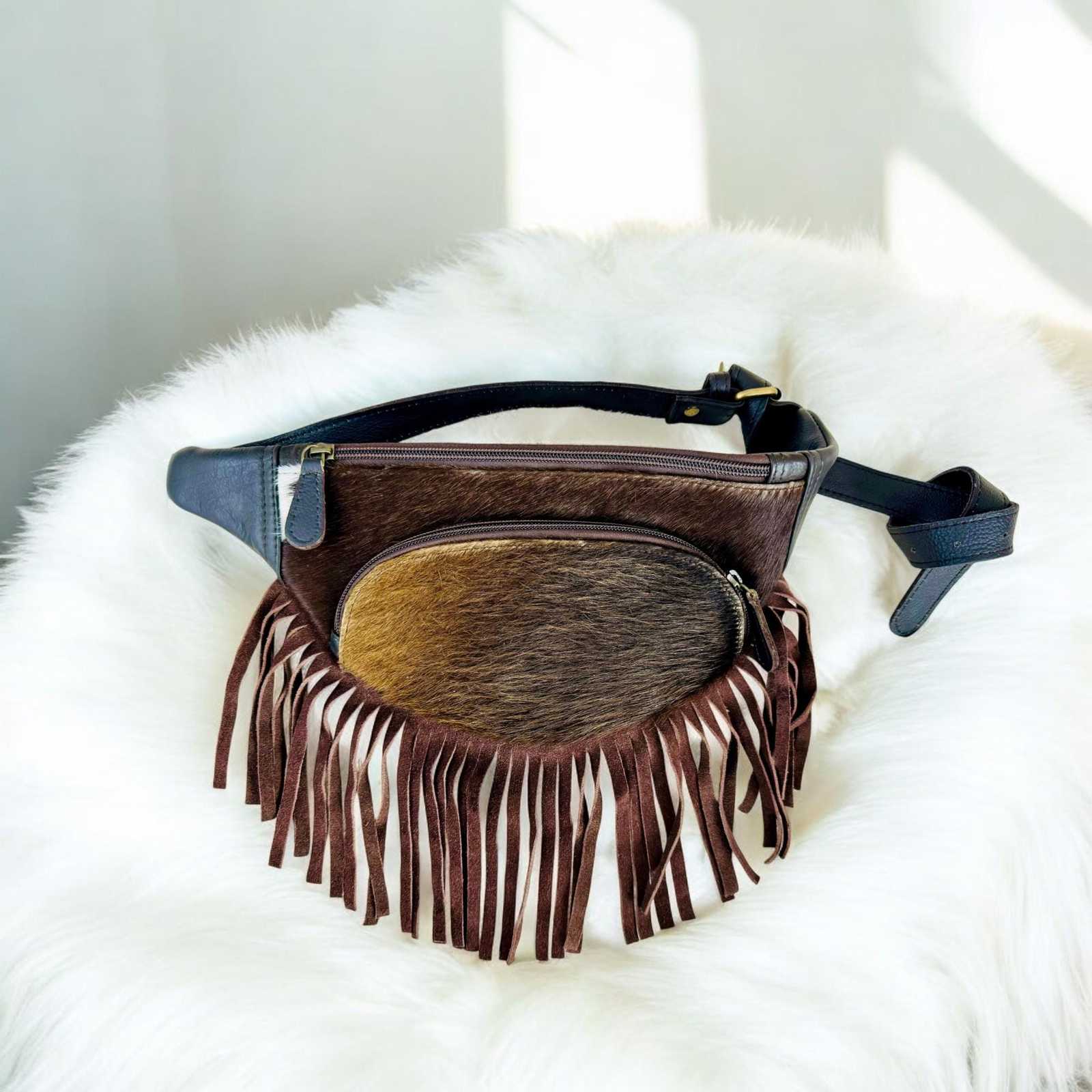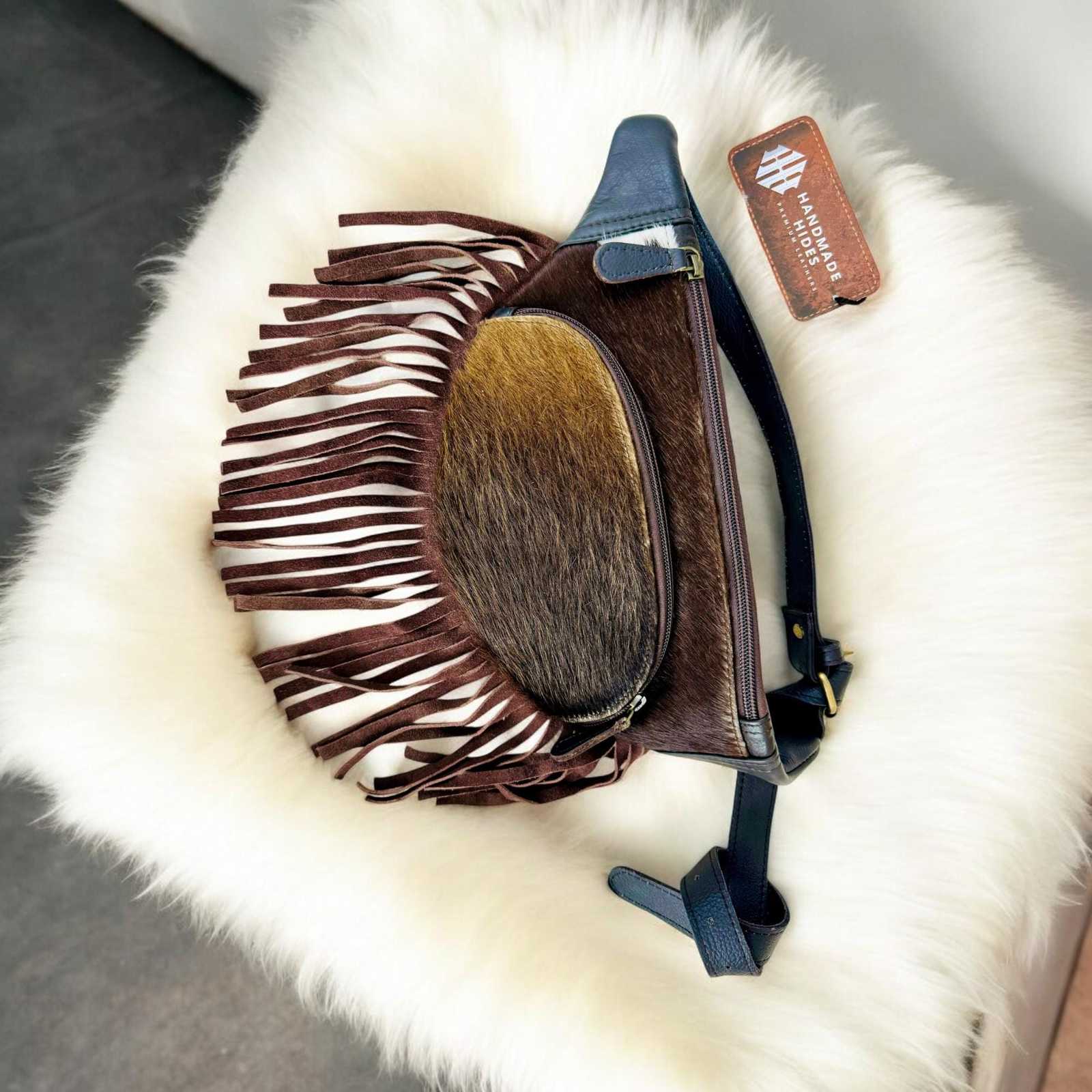 Step out in effortless style with this handmade leather bag, crafted with rustic hair?on leather and finished with soft suede fringe. Designed to be worn as a leather sling bag or waist pack, this versatile piece blends festival?ready flair with practical everyday storage.