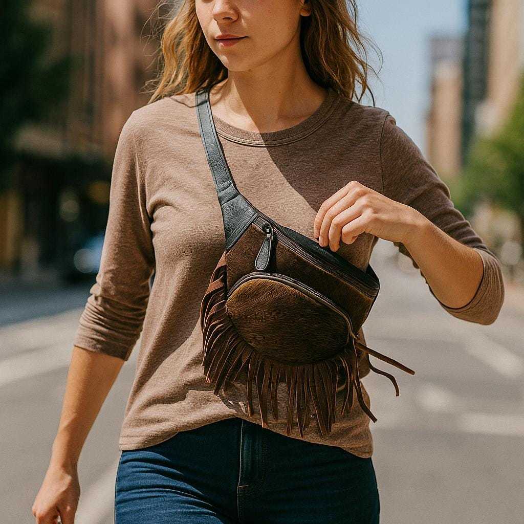 Handmade Leather Sling Bag: Suede Fringe, Hair-On Detail, Boho Festival Style