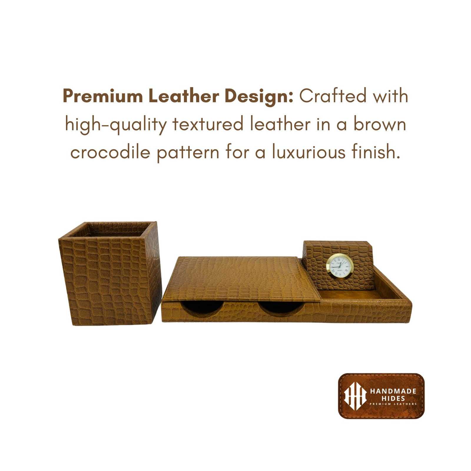 Luxury Leather Desk Organizer Set: Crocodile Texture - Pen Holder, Clock & Tray