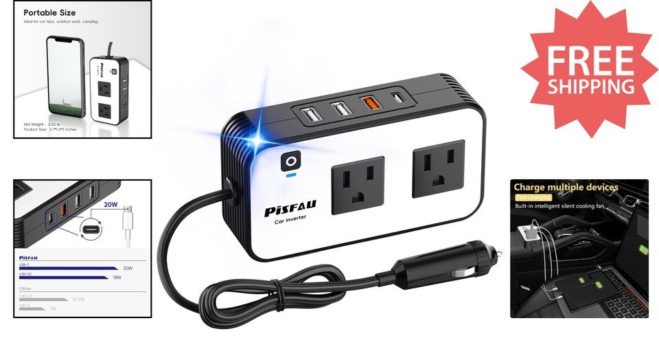 Experience versatile power on the go with our Car Power Inverter, featuring 2 U.S. standard AC outlets and 4 USB ports to charge laptops, tablets, phones, and more. Designed with high efficiency circuitry and advanced heat dissipation, it ensures quiet operation and optimal performance. Its compact, lightweight form (8.5 oz) makes it easy to carry and perfect for travel. Safety is a priority, with fully insulated ABS shell and multiple protection features against overheating, overvoltage, and short circuits. Enjoy peace of mind with our dedicated 24-hour support and a satisfaction guarantee. To ensure fast and reliable delivery, we work with multiple fulfillment partners and suppliers. Depending on availability and location, your order may ship from different warehouses or arrive in packaging that varies from item to item. Tracking details are typically provided shortly after shipment, and customer satisfaction remains our top priority. Please note that due to carrier policies and regional regulations, certain items may not be eligible for delivery to specific states or territories.