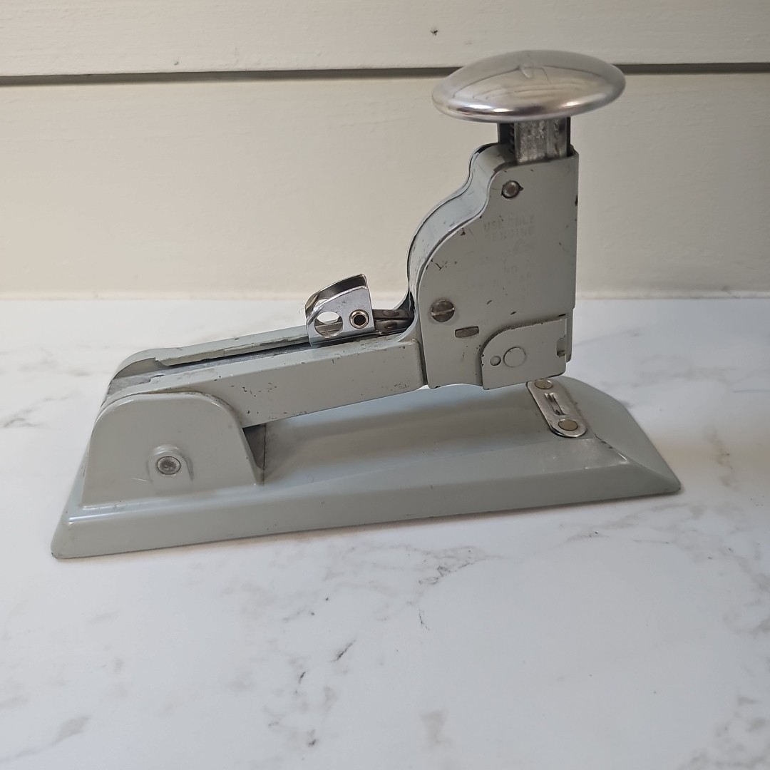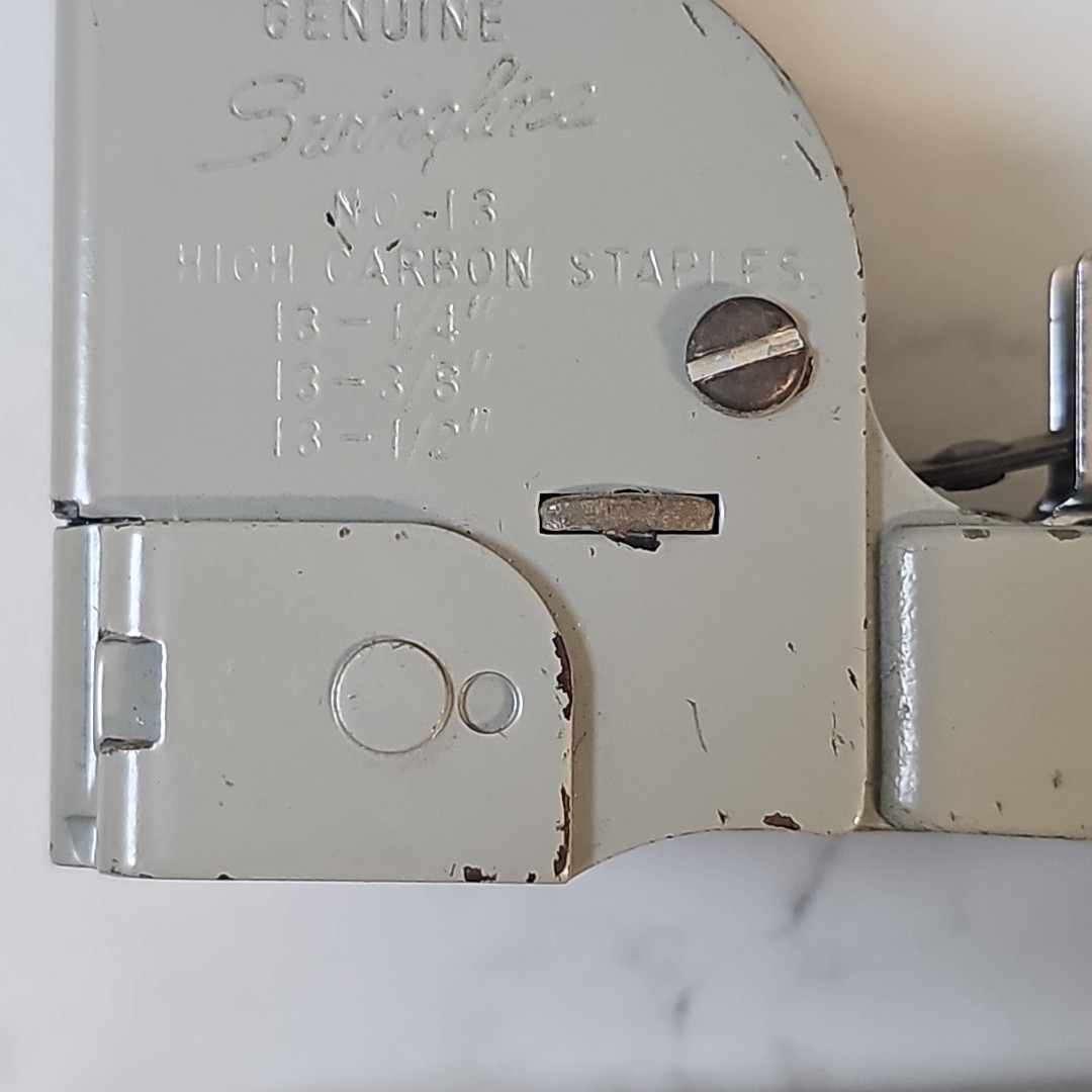 The product is a vintage Swingline industrial heavy-duty steel stapler, model number 13, made in the USA. This standard stapler is known for its durability and reliability, making it a practical choice for various office and industrial uses. With its sturdy construction and classic design, this stapler is a timeless tool that will withstand frequent use while maintaining its functionality.