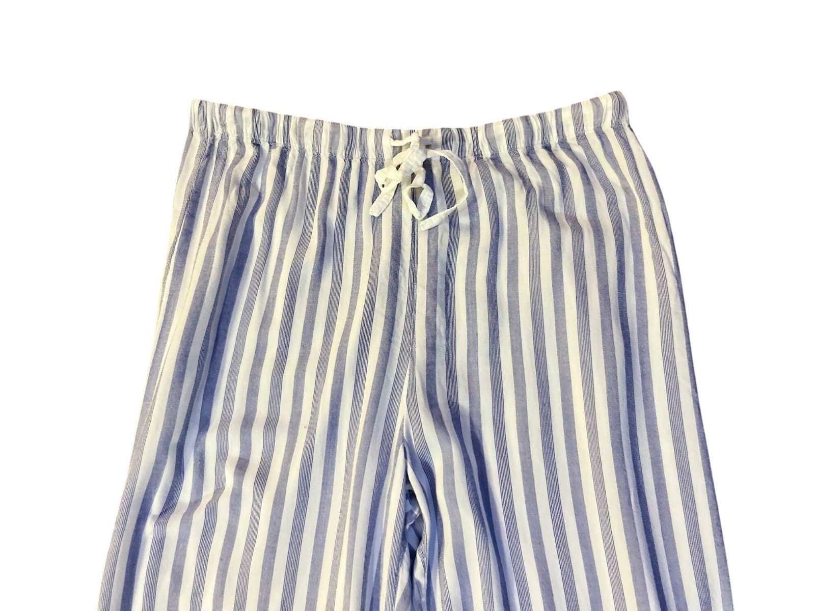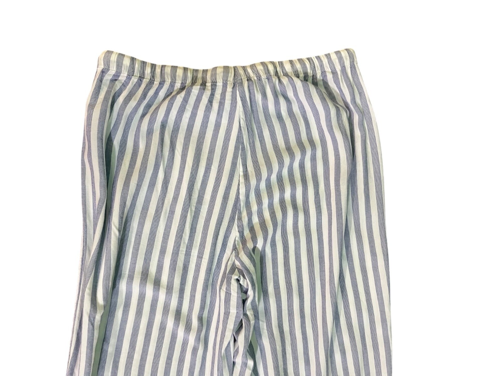 Design: Vertical blue white stripes, elastic aistband with drawstring tie, lightweight and flowy