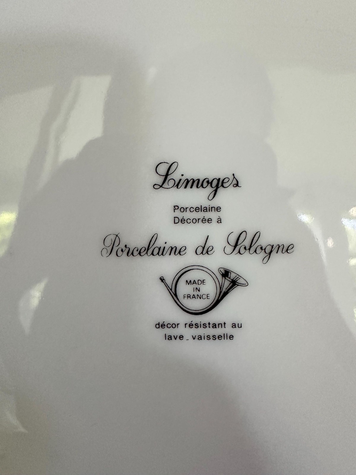 Presenting an exceptional set of four vintage serving dishes crafted by the esteemed French manufacturer, Porcelaine de Sologne. Each piece is a testament to the enduring legacy of Limoges porcelain, renowned for its meticulous craftsmanship and artistic detail. The plates are distinguished by their classic scalloped shell form, a timeless design that offers both aesthetic appeal and practical function for elegant table settings.