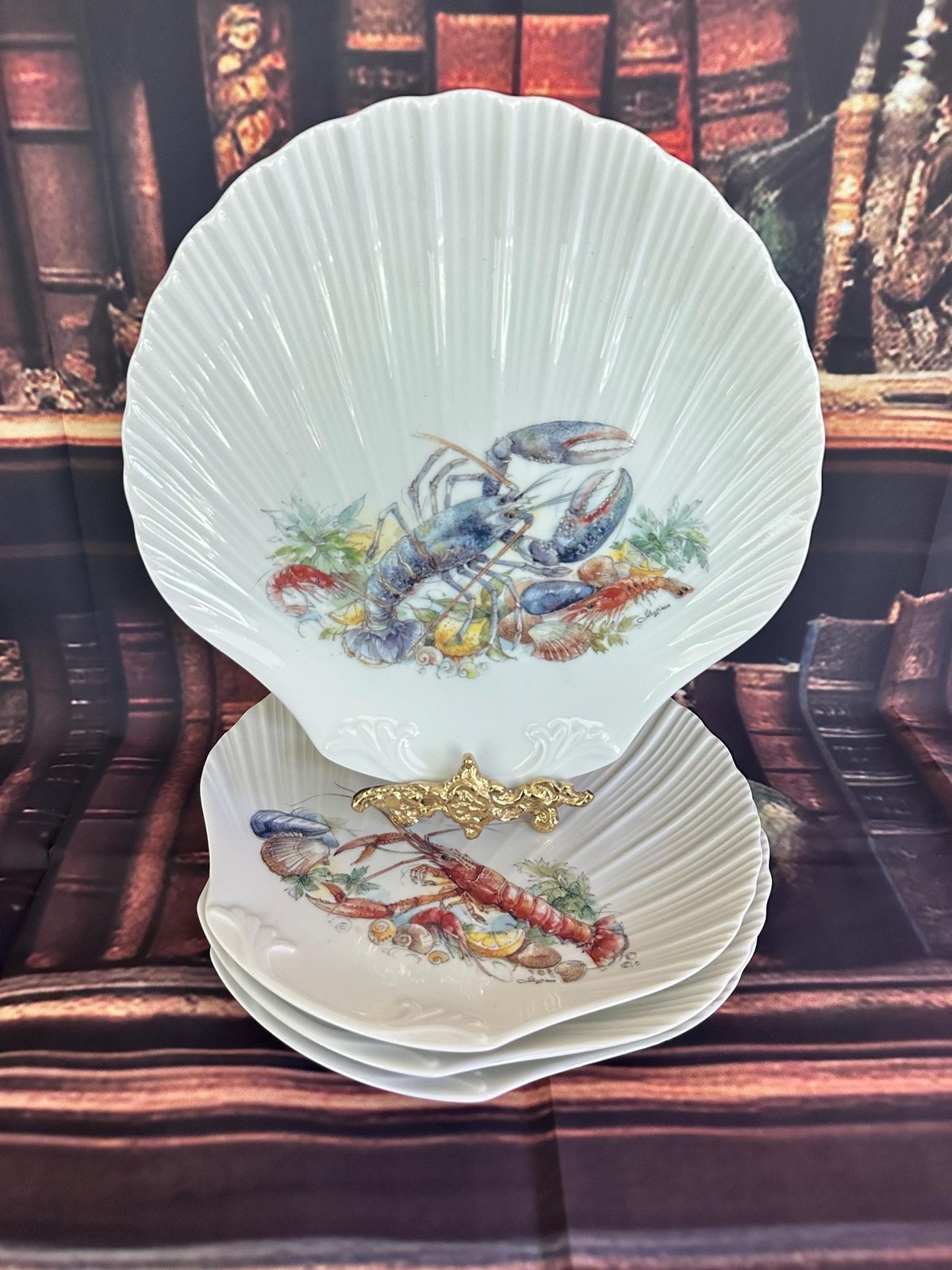 Vintage Limoges Scallop Shell Plates: Hand-Painted Lobster Motif, Set of 4