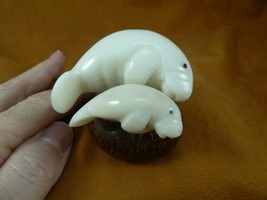 TNE-MAN-708b white Manatee mama + baby sea TAGUA NUT figurine DUGONG