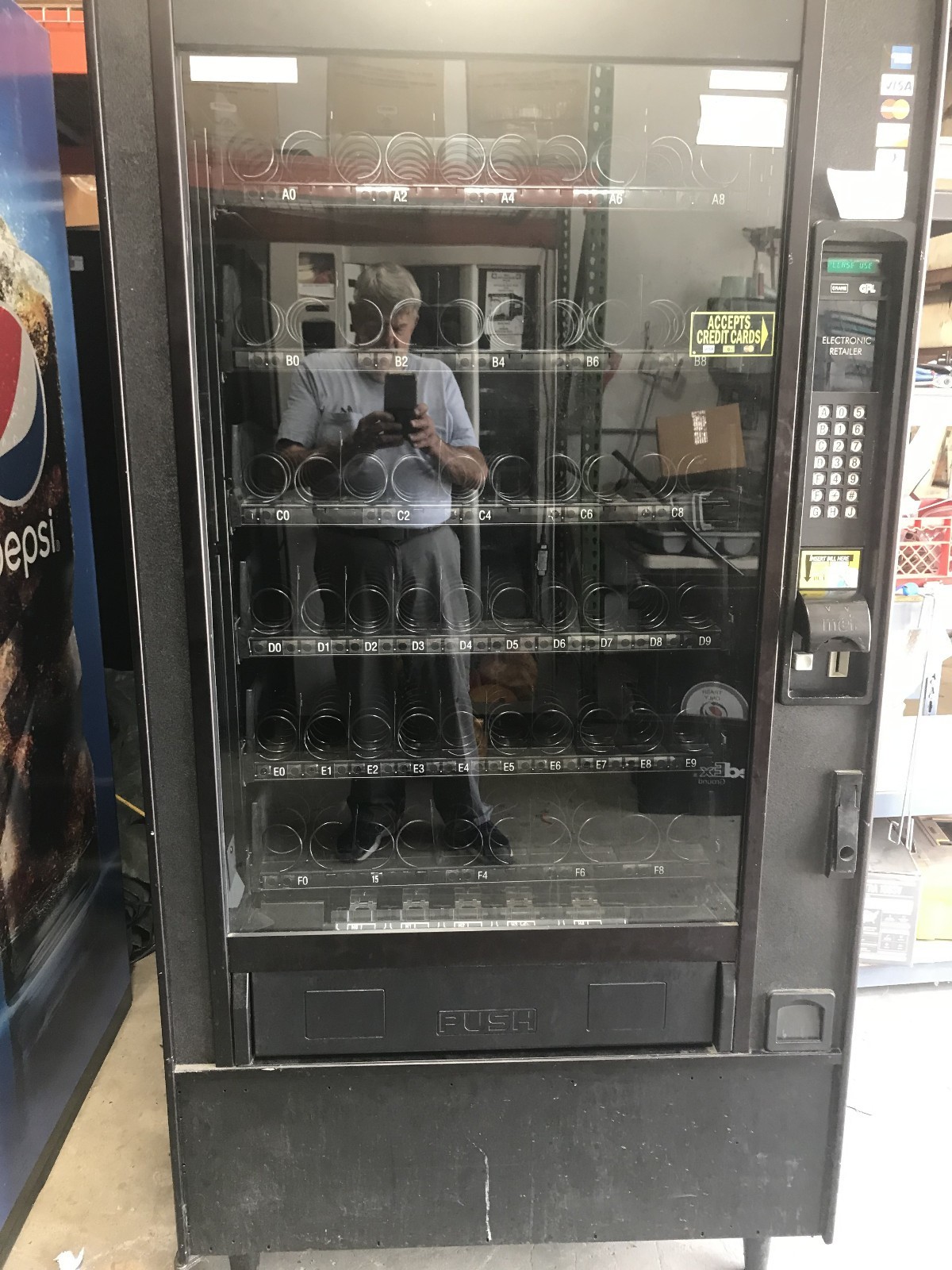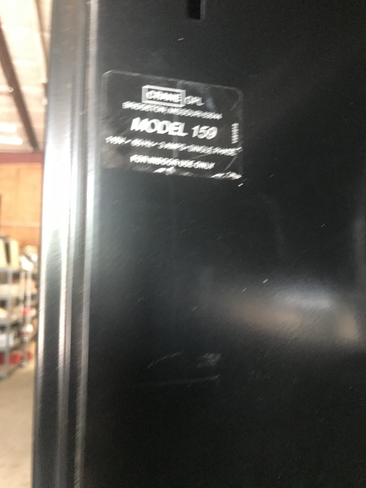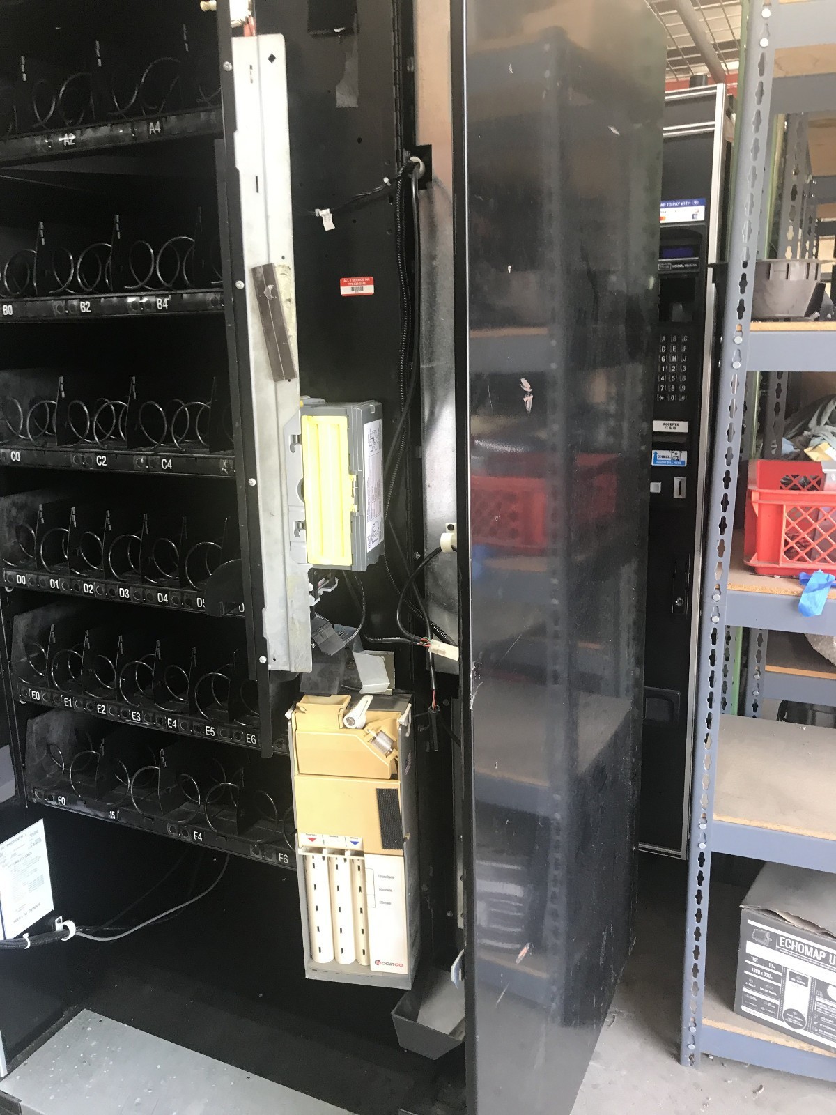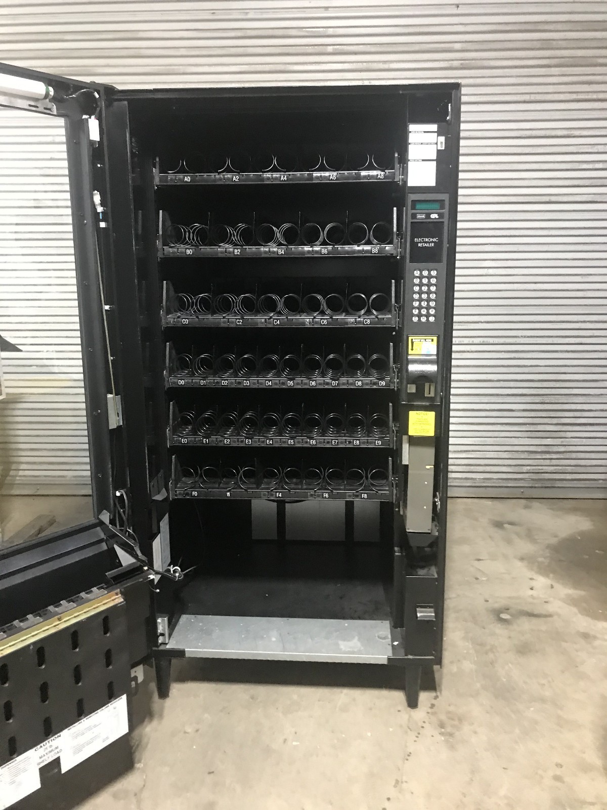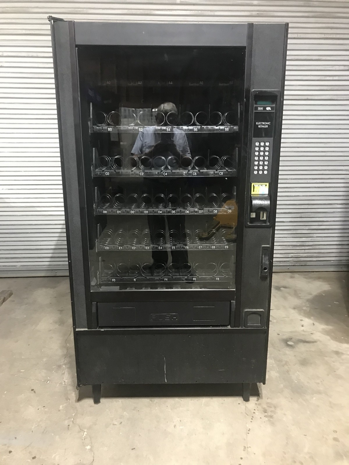 This is a Crane GPL 159 snack machine. The machine is in excellent working condition. It is equipped with a Coinco 9302GX coin mech and an MEI bill acceptor. It is credit card capable but no credit card reader is installed. The exterior is in very good condition with the exception that the lower front trim panel is missing. The missing panel is barely noticeable because the door finish is black. See the pictures. This machine is just as it came off a working location.