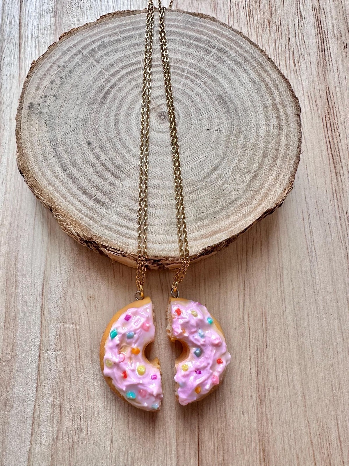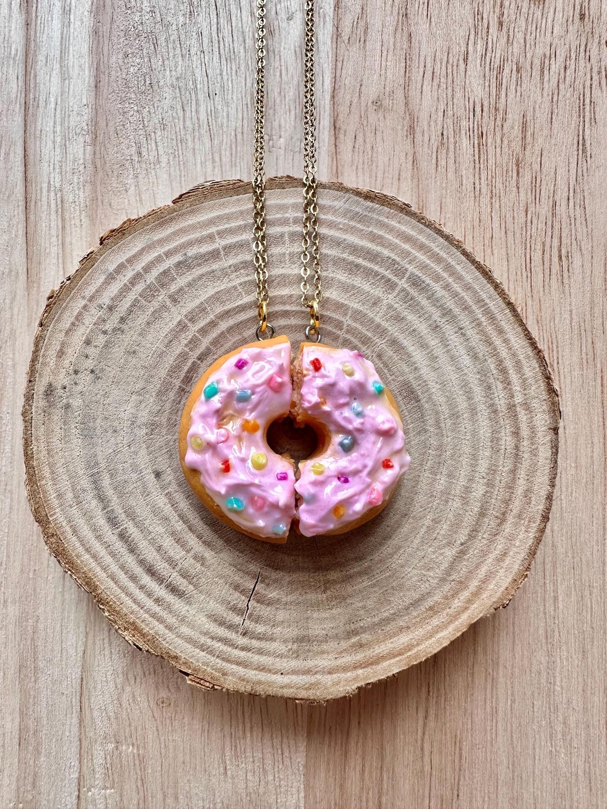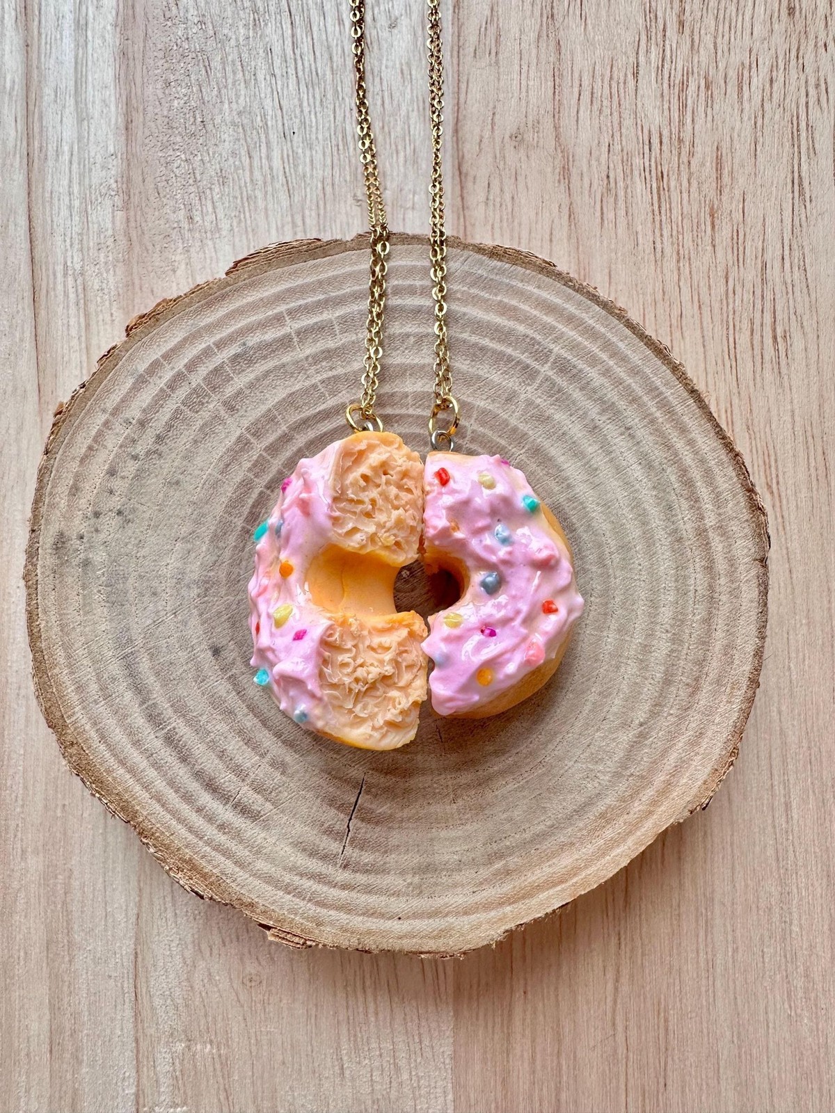 ? Each half of the donut hangs on a gold-tone chain