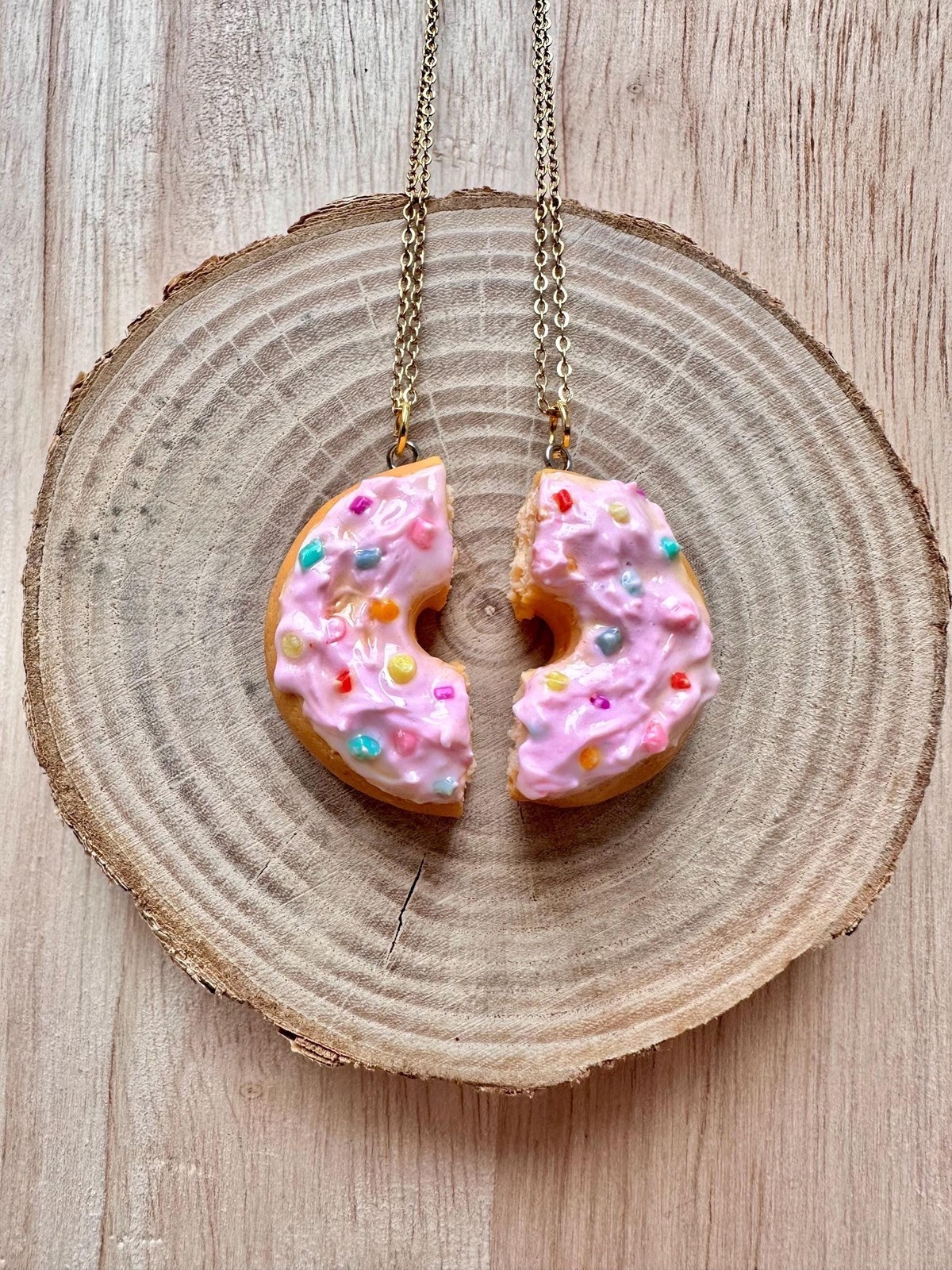 Share the sweetness with this irresistibly cute donut friendship necklace set, designed for besties, soulmates, or anyone you?d never dessert (see what we did there?). This handmade kawaii necklace features a pink frosted donut with rainbow sprinkles ? perfectly split into two matching halves, each on its own gold chain.