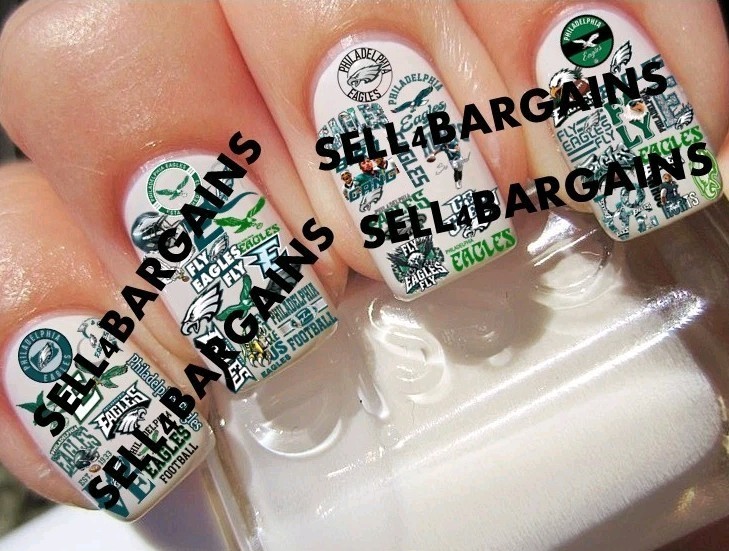 This is a listing for 100 Philadelphia Eagles salon quality promo nail decals with clear transfer graphic art nail designs as pictured.