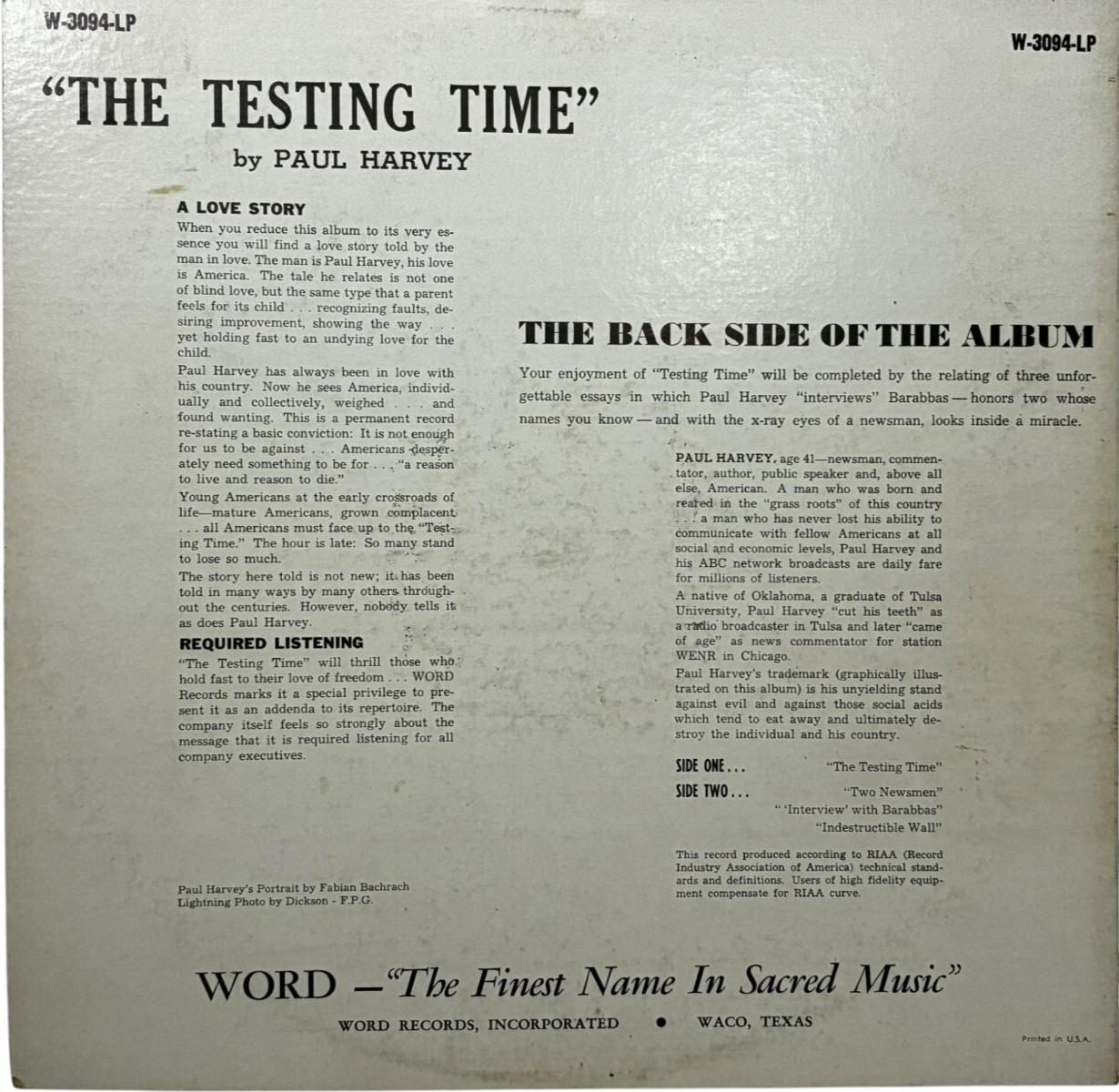 PAUL HARVEY TESTING TIME VINYL LP RECORD ALBUM RARE WORD 3094 PLAY TESTED