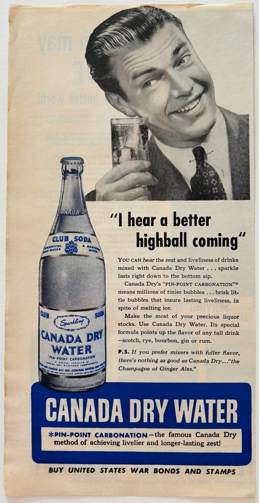 1944 Canada Dry Sparkling Water Advertisement WW2 Carbonated Club Soda E90E3