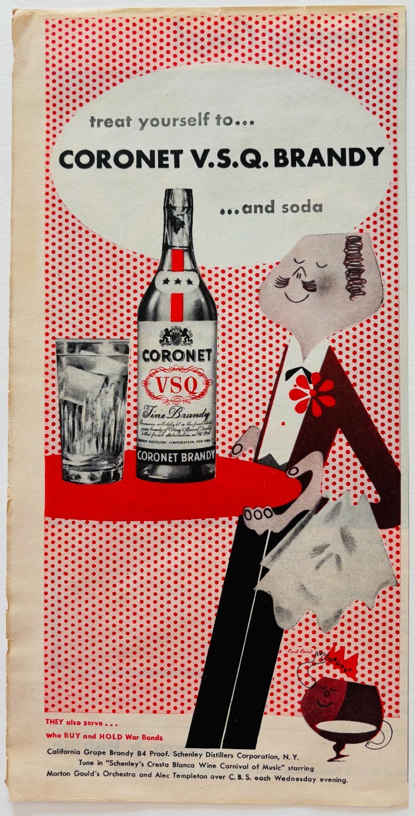 1944 Coronet VSQ Brandy Advertisement WW2 Era Liquor Distillery War Bonds E90E3