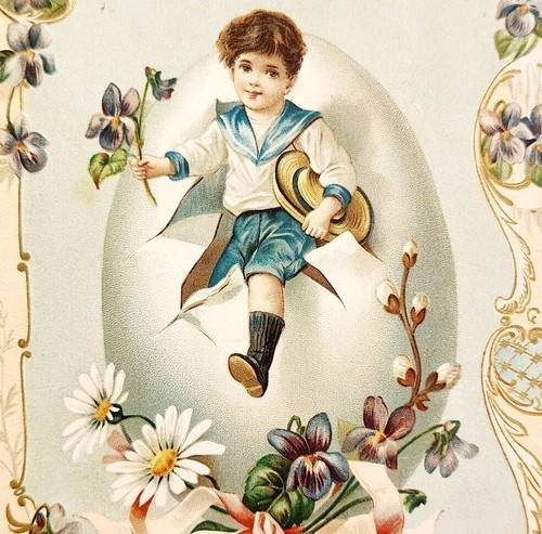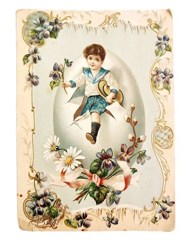 C1890s Victorian Trade Card XL Embossed Boy From An Egg Floral Lithograph E83A