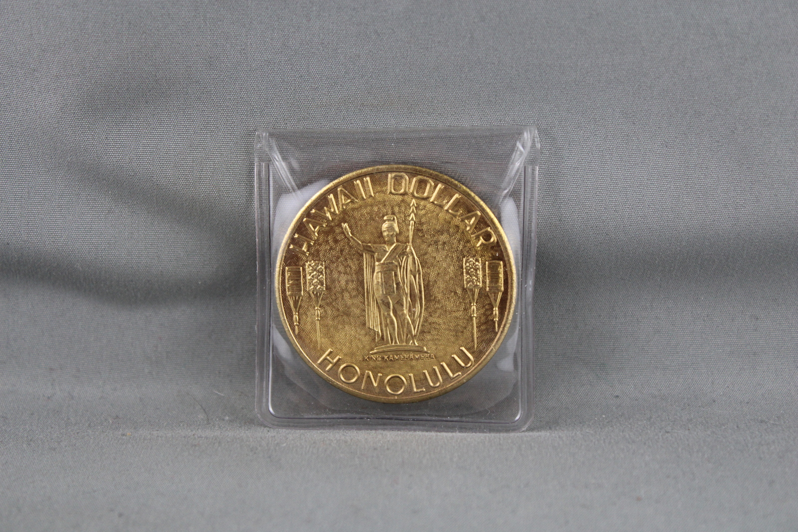Up for sale is a 1970s Hawaiian Dollar tourist coin. One side has King Kamemeha stamped in, and the other side of the coin has a graphic of Diamond Head Beach stamped in. What a great addition to any colleciton.
