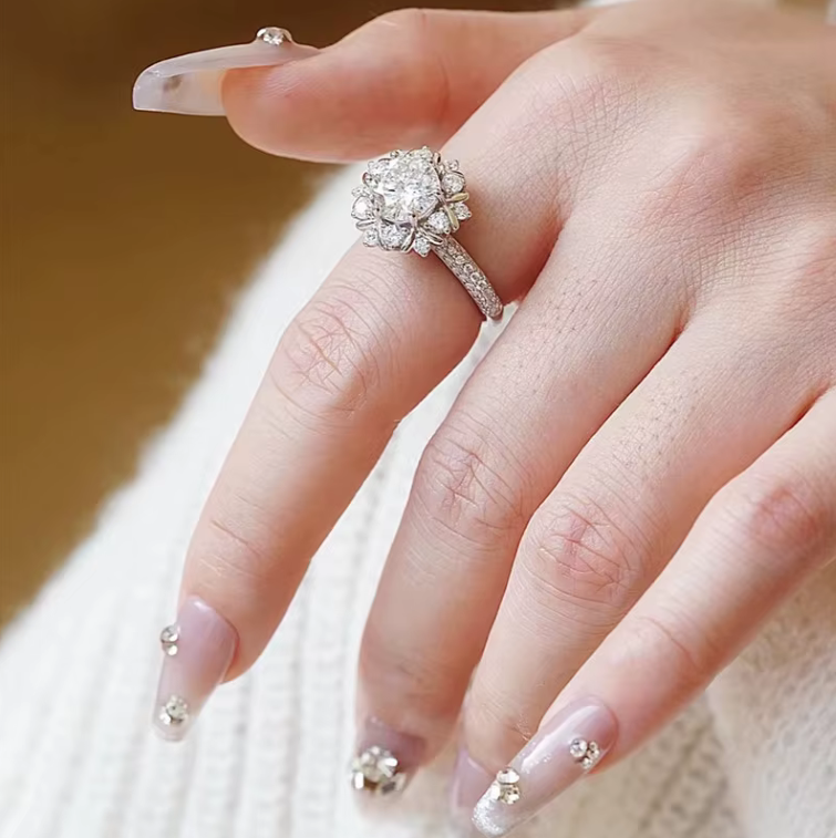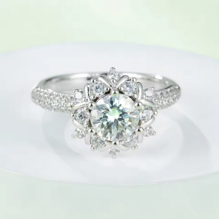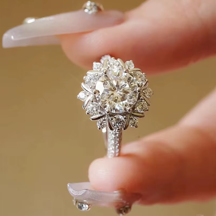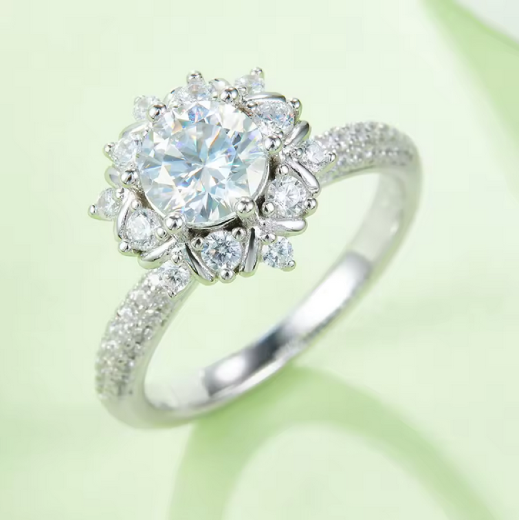 18K 925 Sterling Silver 1CT Round Cut Moissanite Flower Design Ring (Size 6-9)