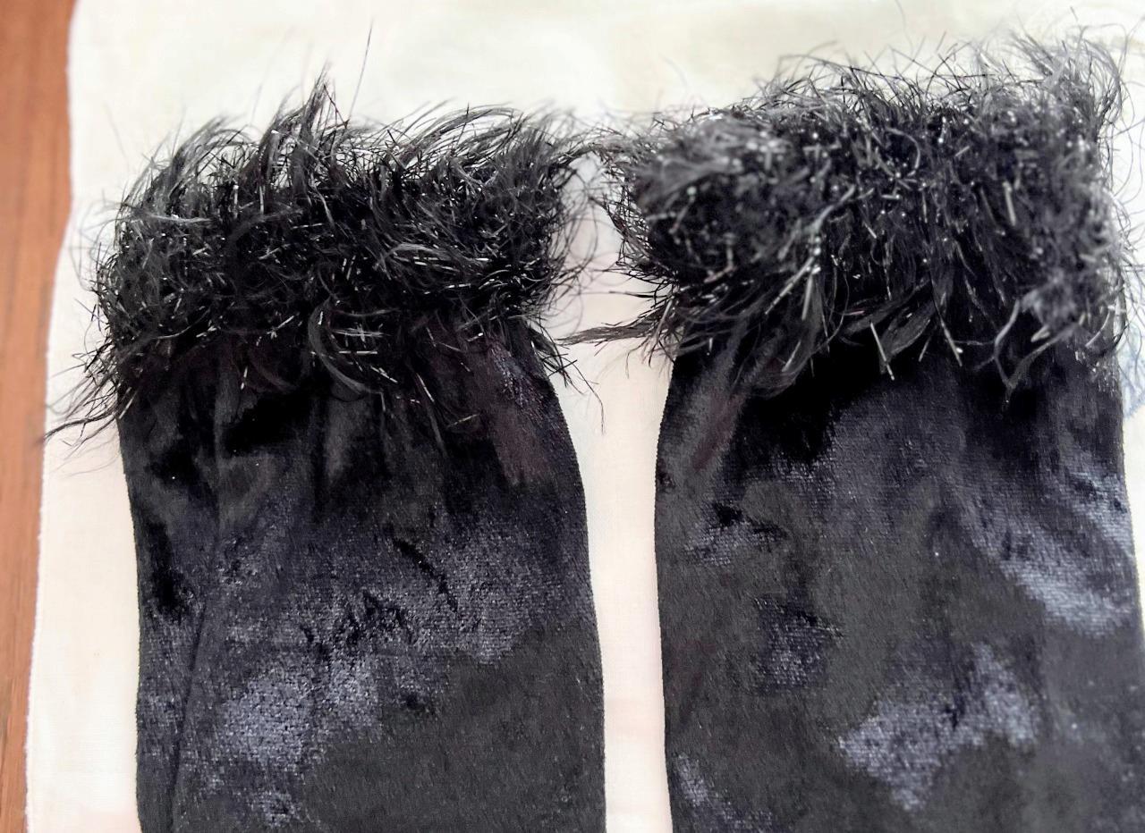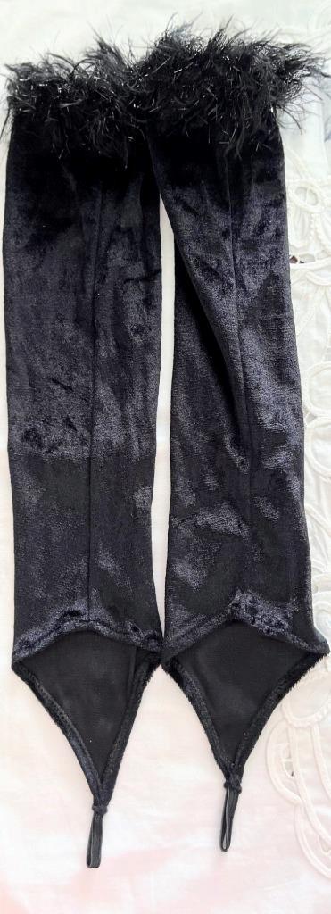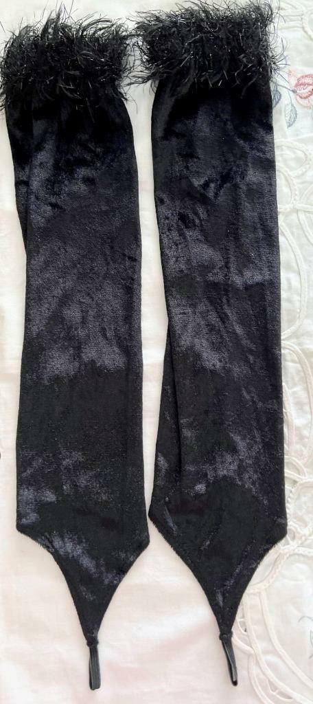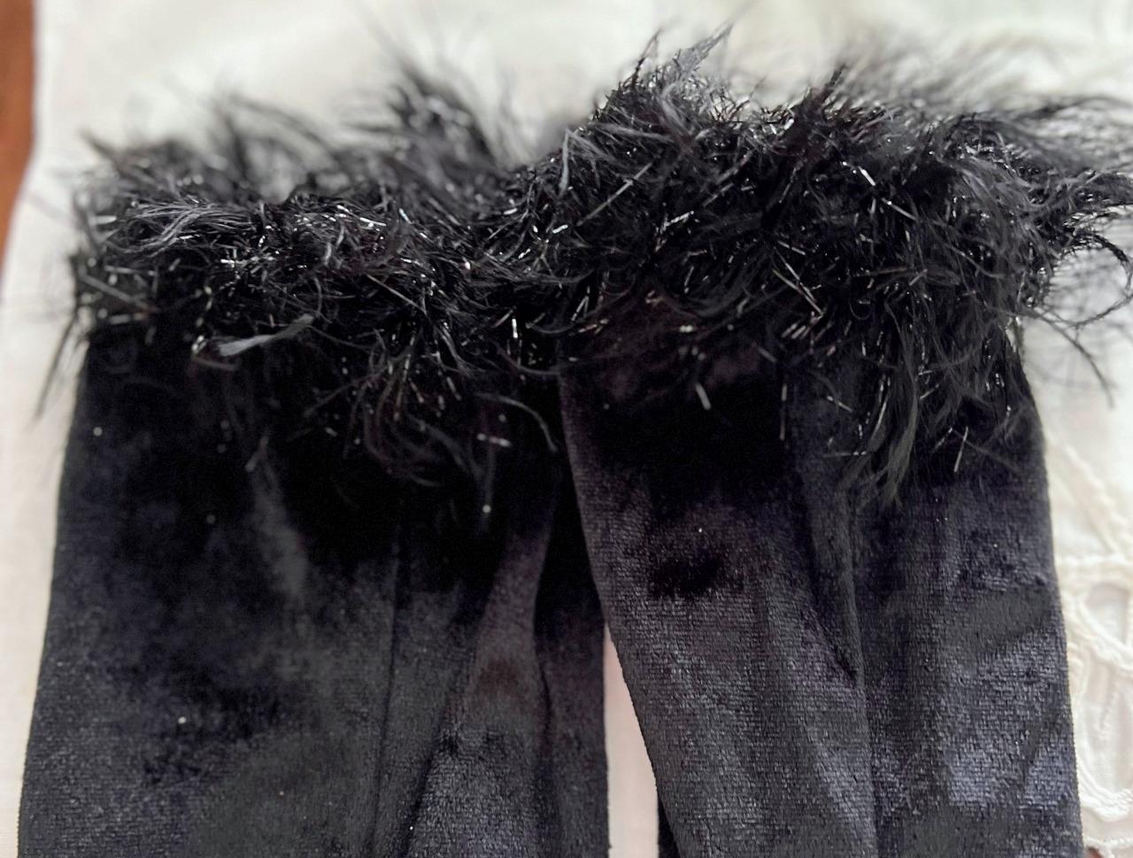 Vintage Black Velvet Opera Gloves Fingerless Black Glittery Feathers 18" Length