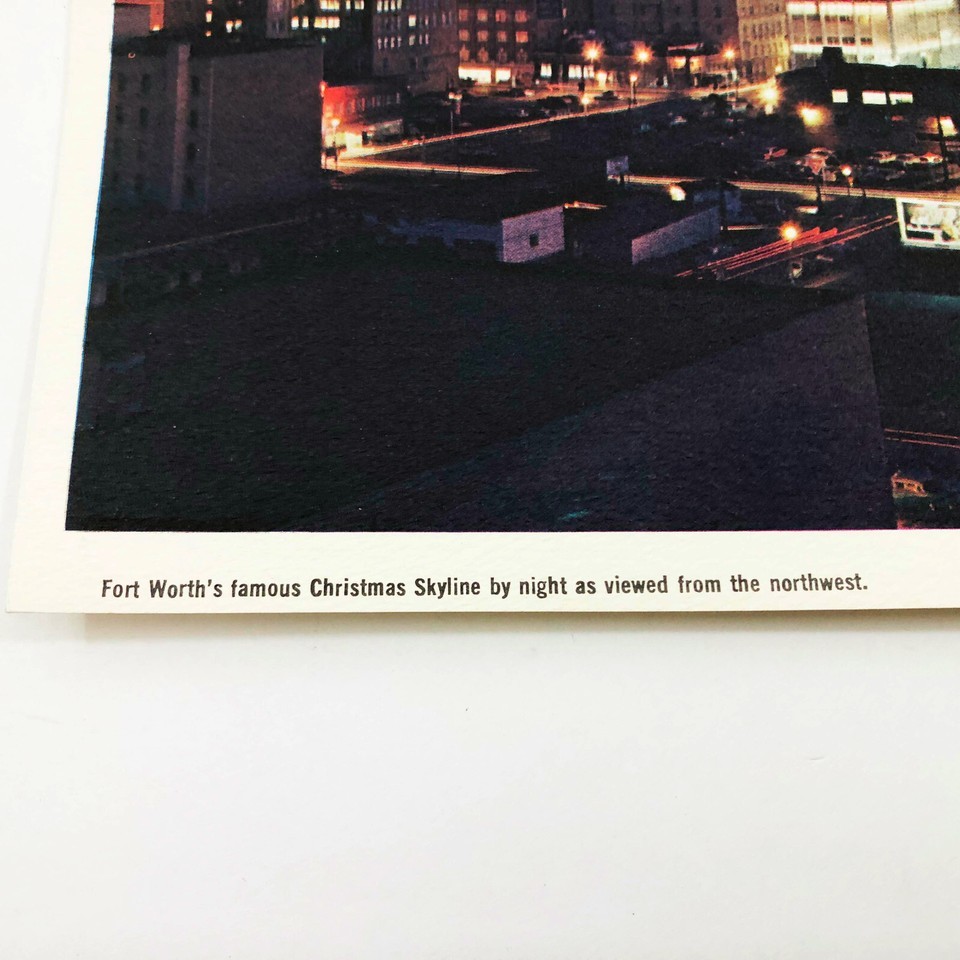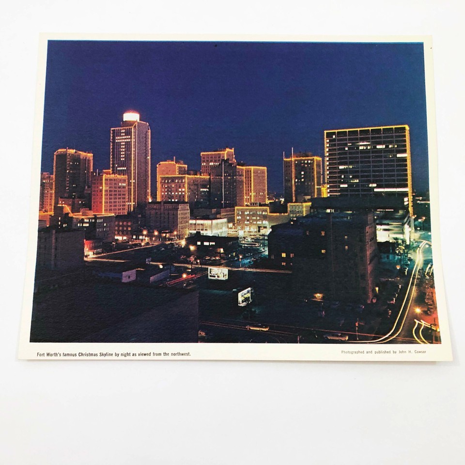 The skyline of Fort Worth Texas Christmas time as viewed from the Northwest. Printed on parchment type photo paper. Photographed and published by John H. Cowsar