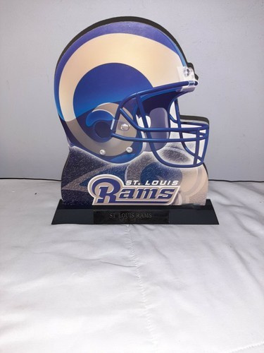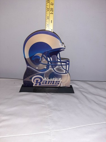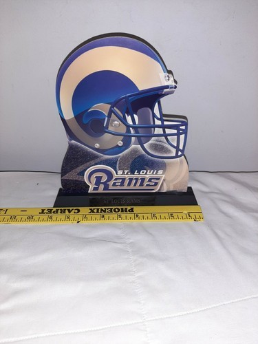 NFL St. Louis Rams Football Mini Helmet Cutout on Stand. This is approximately 9.5 inches tall, 8.75 inches wide (base) and 1.5 inches deep (base).