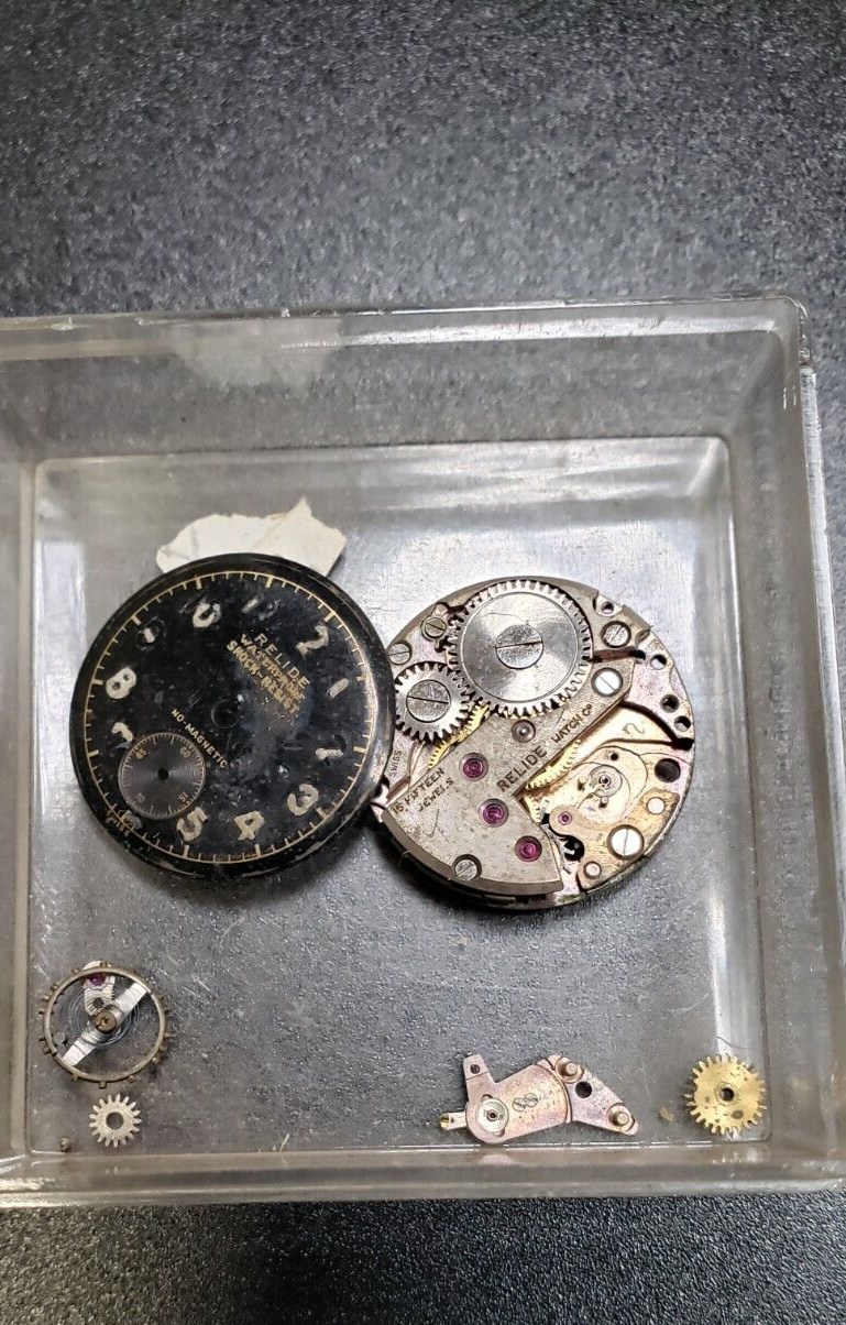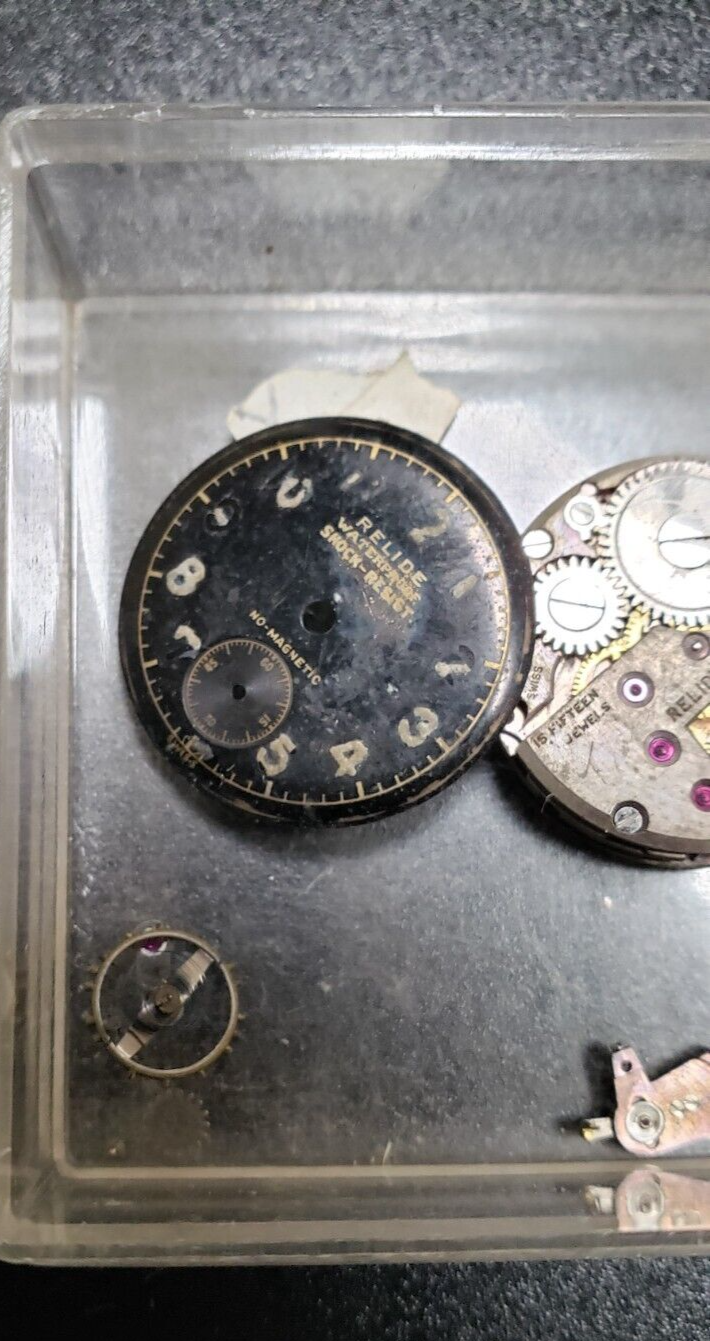 RARE Vintage LOT 1960's Relide Watch Black Dial Movement Gear Waterproof 15J see condition above. I am not an expert on these. We got a huge supply off a watch maker that went out of business years ago. He had all these movements in this container, as if it was the same timeframe or something. This is nice watch movement lot here. Not sure where the rest of this is. But hopefully you can use this!!!! This should be good lot for watch maker / repairer. this may need to be cleaned up, but does not have scuffs or scratches Please check out my other vintage watch parts and crystal. we have lots of them and more to list. I will give deals on multi-orders!!!! FREE SHIP IN USA