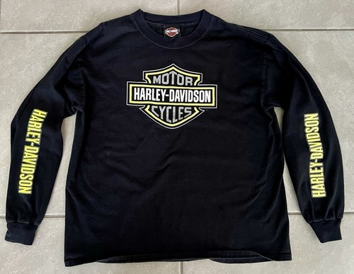 This Harley-Davidson long sleeve graphic t-shirt is perfect for teens who love to ride. The shirt features a solid black color with green accents, a crew neckline, and a featured graphic of the New River Valley in Christiansburg, VA. The shirt is sized as Youth XL for a comfortable fit.