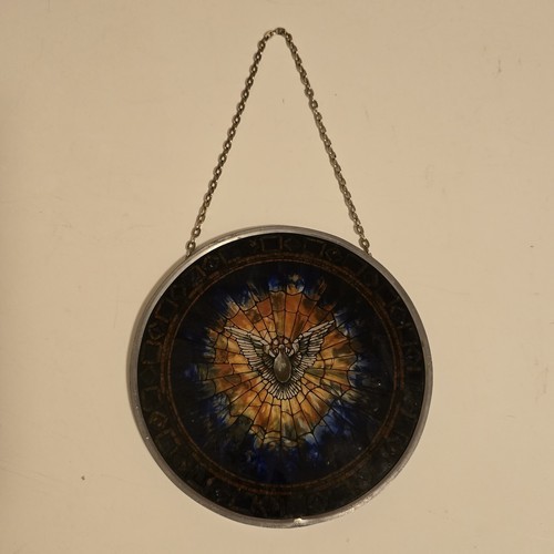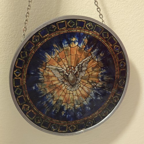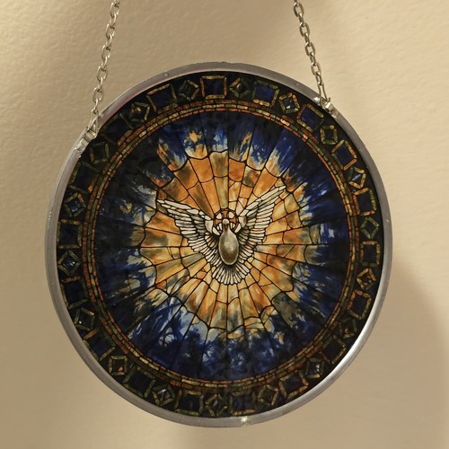 Excellent Condition Glassmasters The Holy Spirit 6 /?" inch Round Stained Glass Tiffany Style Suncatcher with a 5 /?" inch chain.